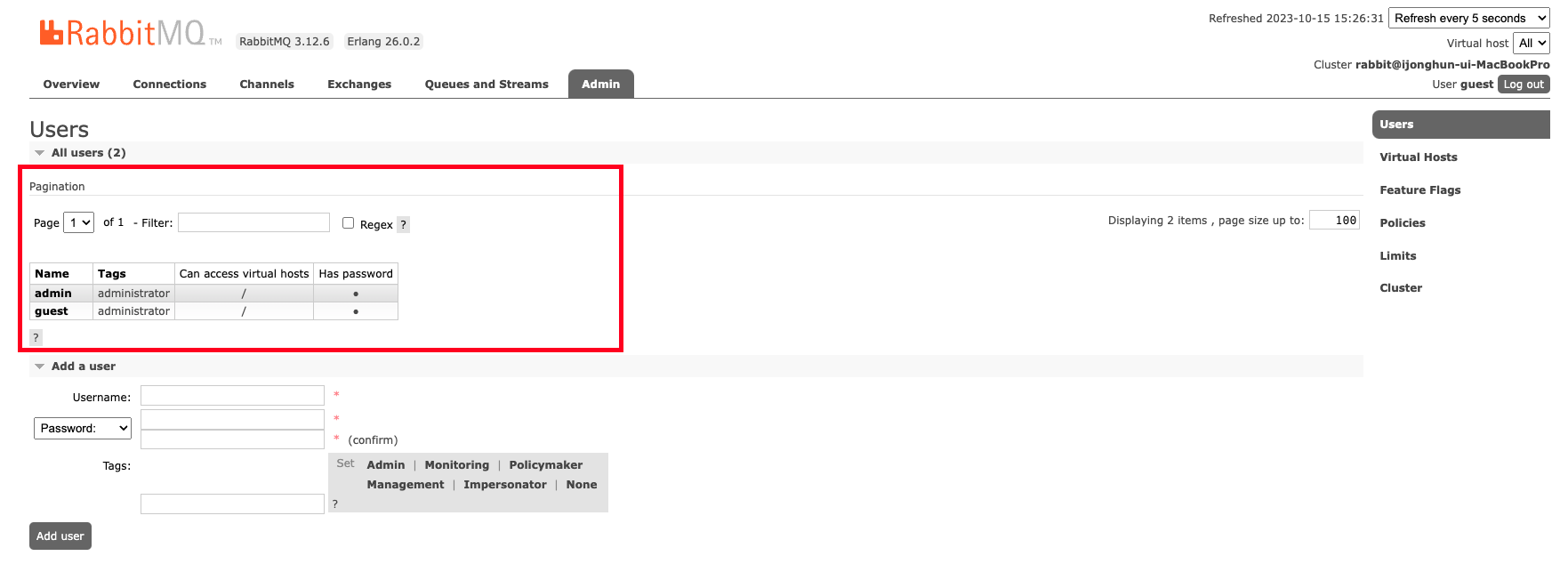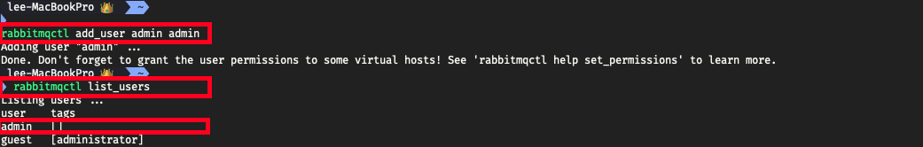 💡 RabbitMQ 내의 사용자 아이디를 생성하고 조회합니다.