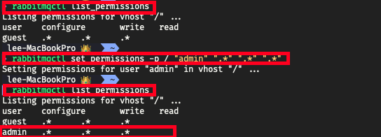 | rabbitmqctl clear_permissions -p | 사용자 권한 제거 | rabbitmqctl clear_permissions -p <vhost> <username> |
