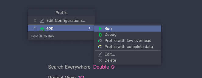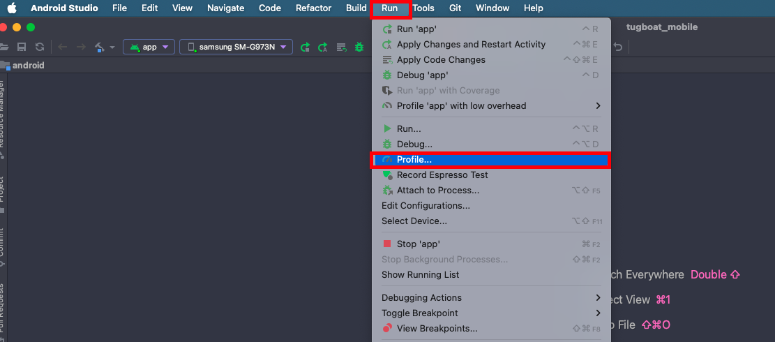 2. Android Studio에서 Run - Profile... 을 누릅니다