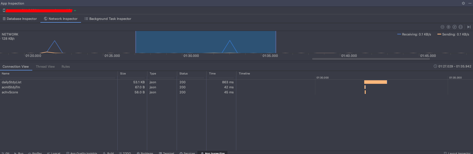 5. 현재 수행중인 앱에 대한 Database Inspector, Network Inspector, Background Task Inspector를 확인할 수 있습니다