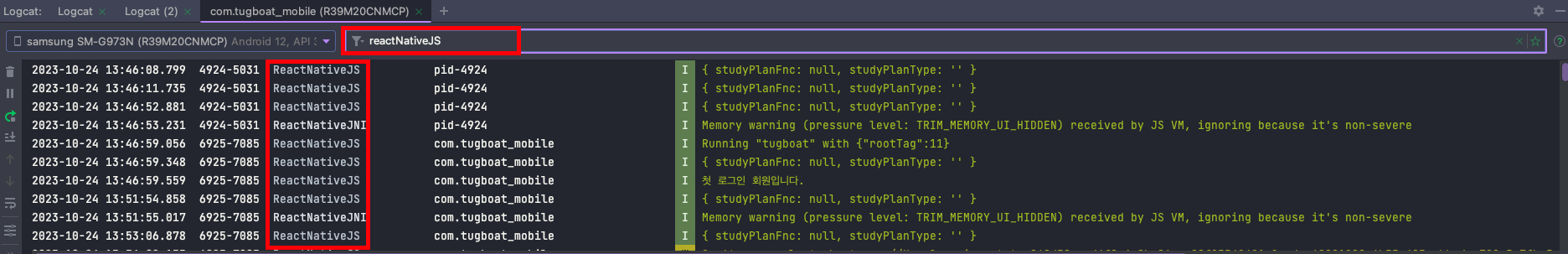 3. ReactNative 관련 메시지만 보고 싶으면 “ReactNativeJS” 필터를 걸어주면 콘솔 출력에 대한 로그만 확인이 가능합니다