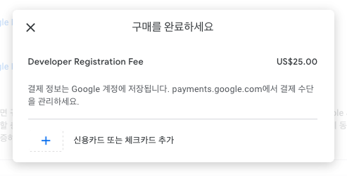 💡 최초 개발자 등록을 위해 $ 25.00 달러를 지불해야 구글 개발자로 등록할 수 있습니다.