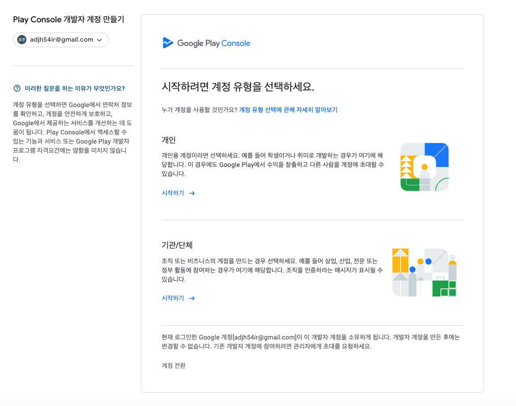 💡 계정이 개인 혹은 기관/단체에 대한 계정유형을 선택합니다.