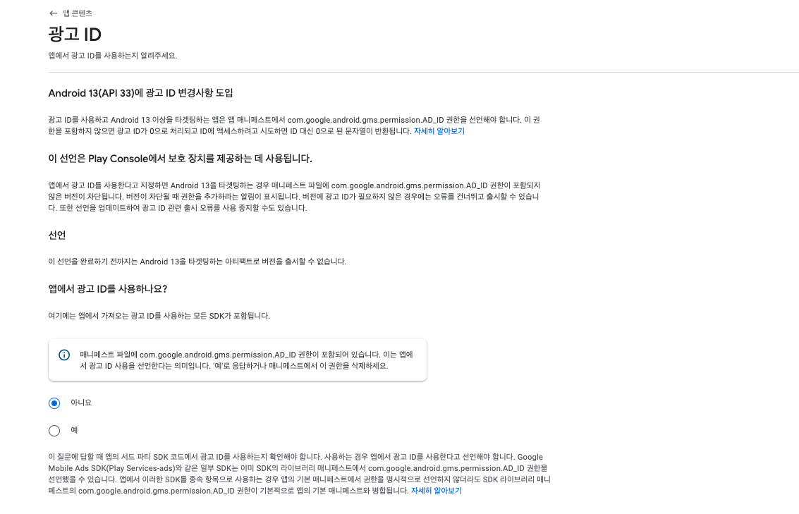 - 앱 액세스 권한, 광고, 콘텐츠 등급, 타겟층 등과 같이 앱을 출시하기전 앱에 대한 분류 및 설정을 위한 작업입니다.