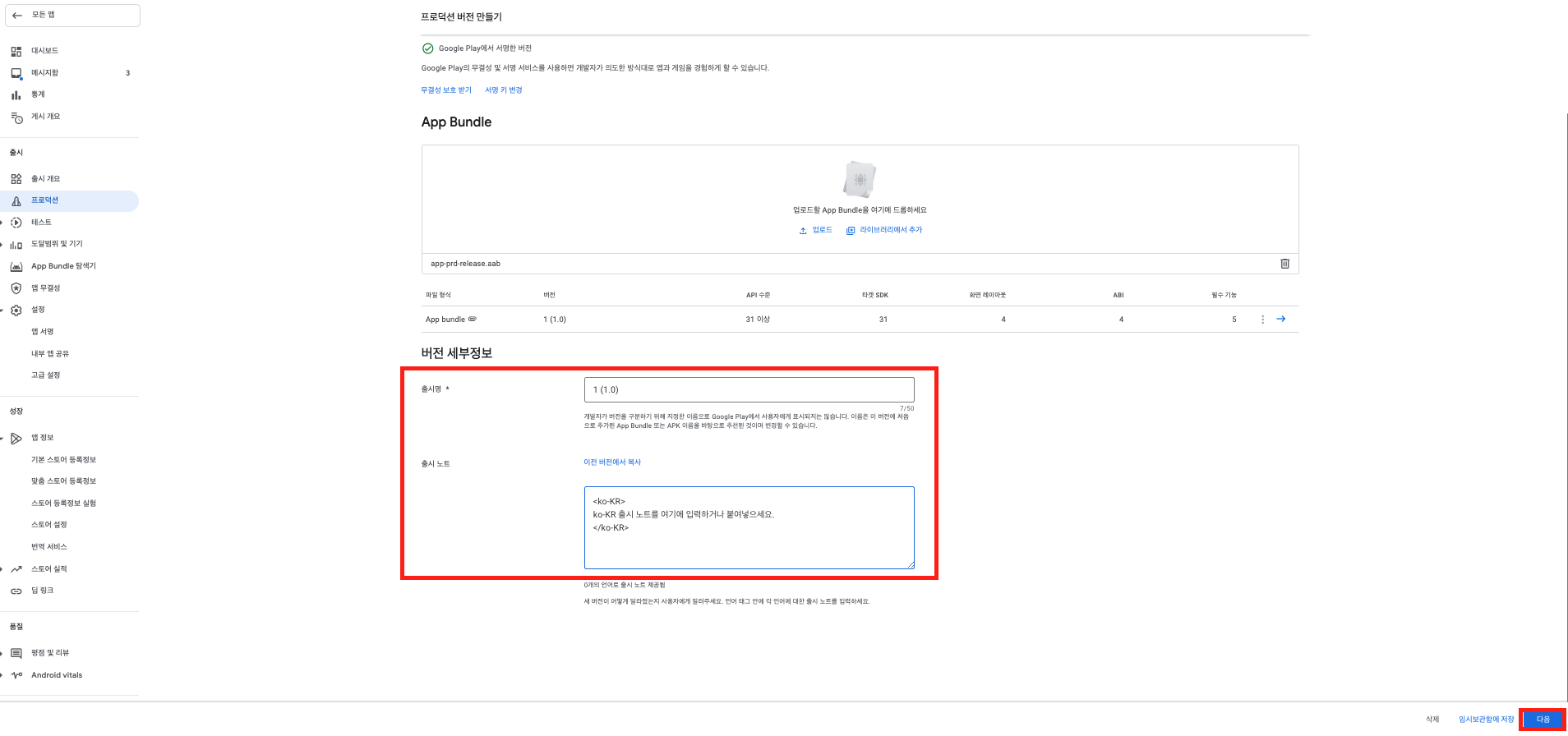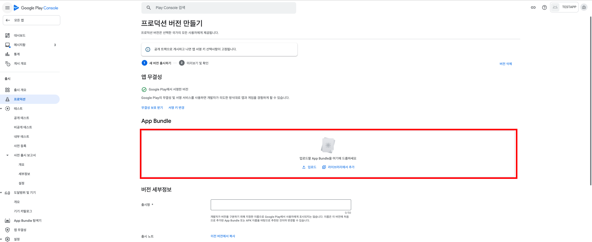 - 사전에 구성한 .aab 파일을 업로드합니다.