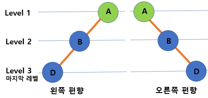 트리의 모든 노드가 한 쪽(왼쪽, 오른쪽)으로만 자식을 가지는 이진 트리
