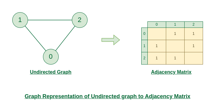 - 노드의 개수를 N이라고 할 때, N x N 크기의 배열을 사용하여 그래프의 각 노드 간 연결 여부를 표현합니다. - 그래프의 연결 관계를 0 또는 1로 구현을 합니다. 만약 노드 간에 연결이 있다면 1을 나타내고 연결이 없으면 0으로 나타냅니다. - 인접 행렬은 노드 간의 연결 관계를 상수 시간에 확인할 수 있으며, 간선의 개수에 비례하는 메모리 공간을 요구합니다. 그러나 그래프가 희소한 경우 메모리 낭비가 발생할 수 있습니다.