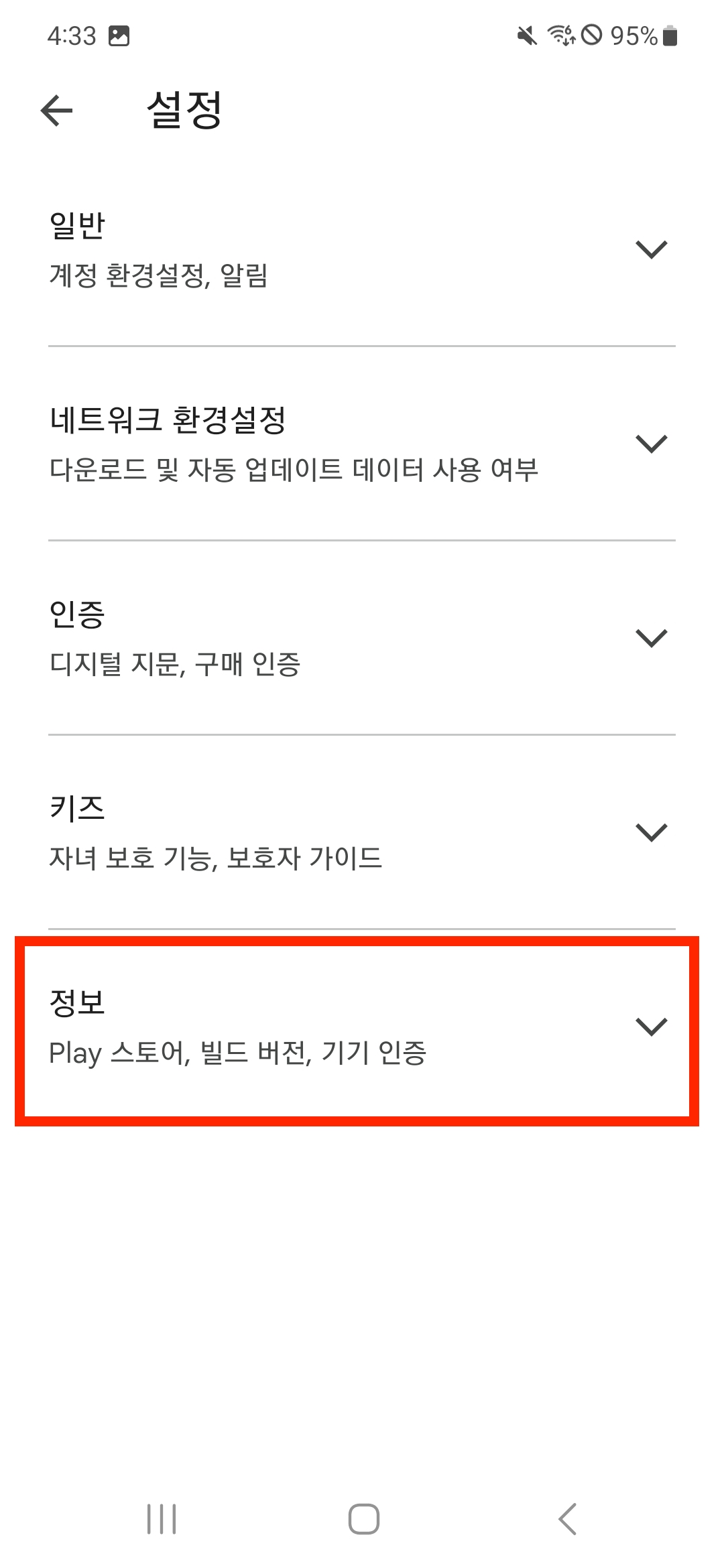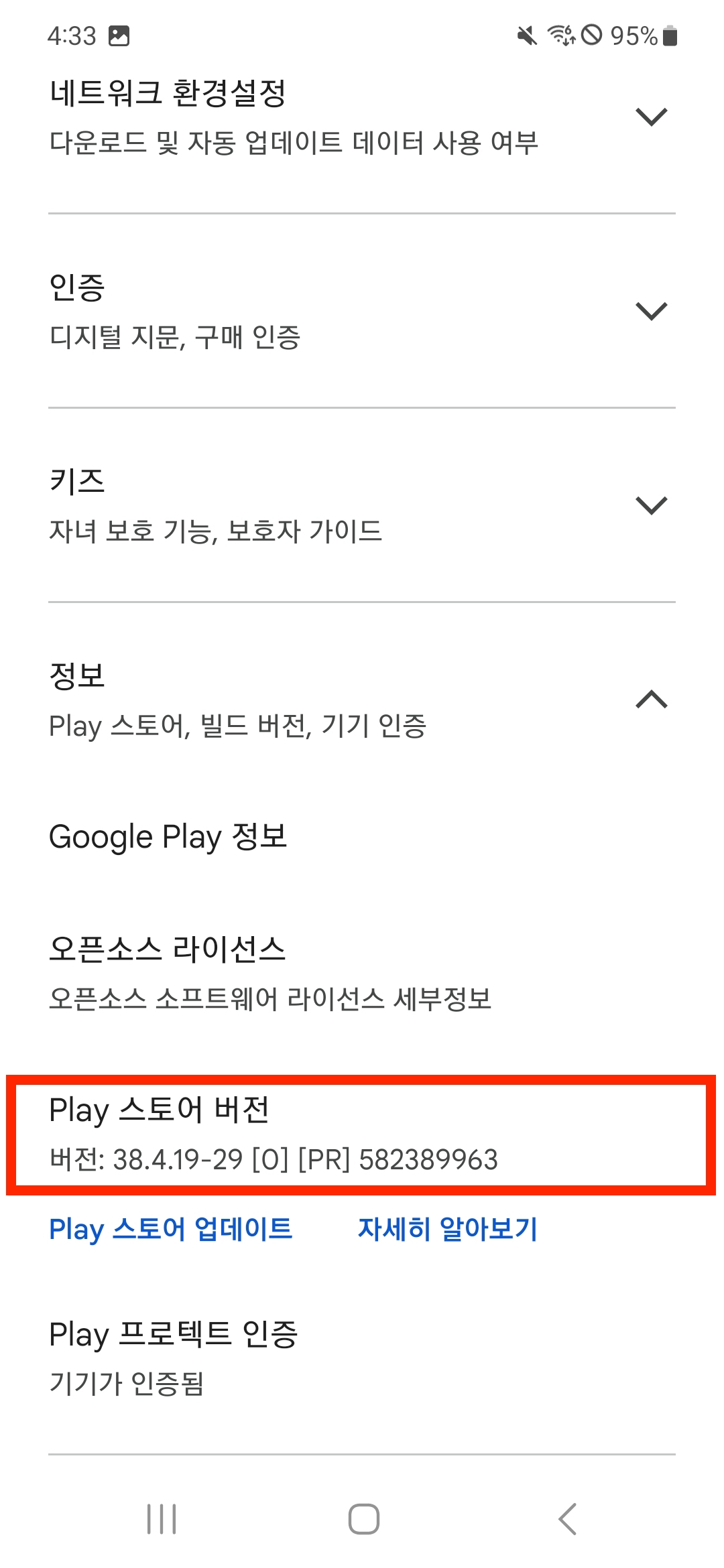 3. 정보 탭의 Play 스토어 버전을 5번 연속으로 터치하면 개발자 모드가 활성화 됩니다.