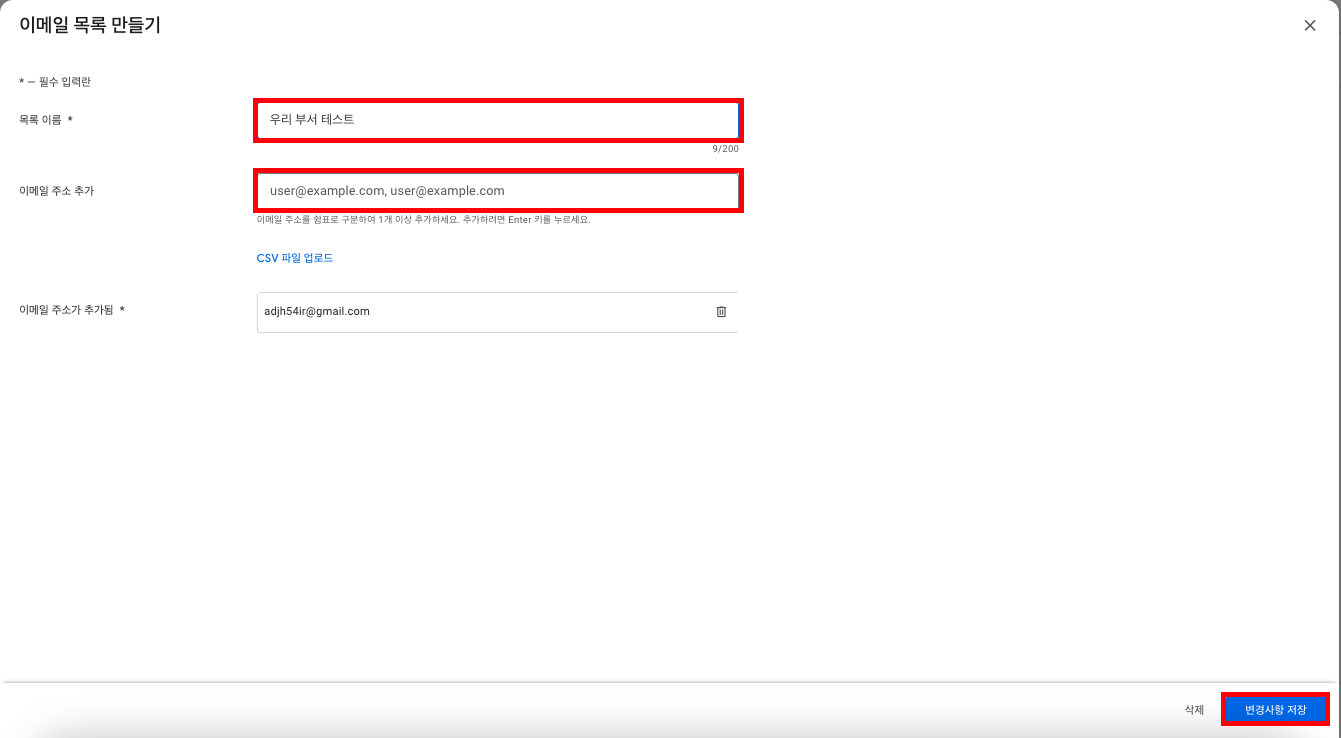 - 목록 이름을 적고 이메일 주소 추가는 입력 후 엔터를 눌러서 추가합니다. (*단 해당 이메일은 모두 @gmail.com을 가지는 이메일로 입력해야 합니다)