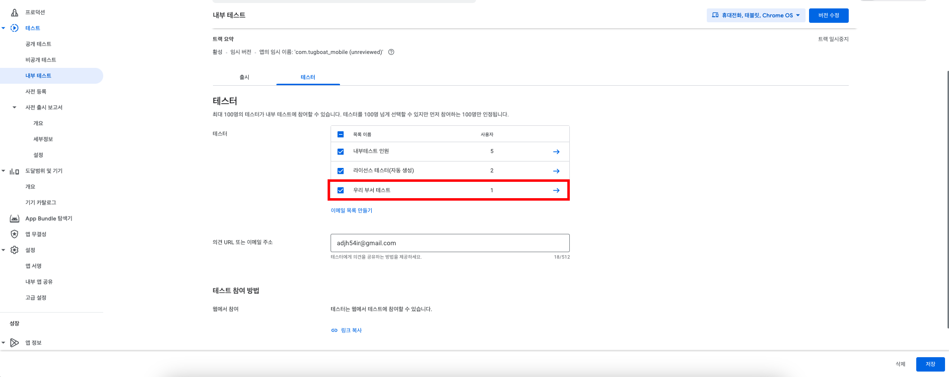 6. 내부 테스트 관리를 위한 목록을 위해 ‘목록 이름’, ‘이메일 주소 추가’를 입력하고 ‘변경사항 저장’을 합니다