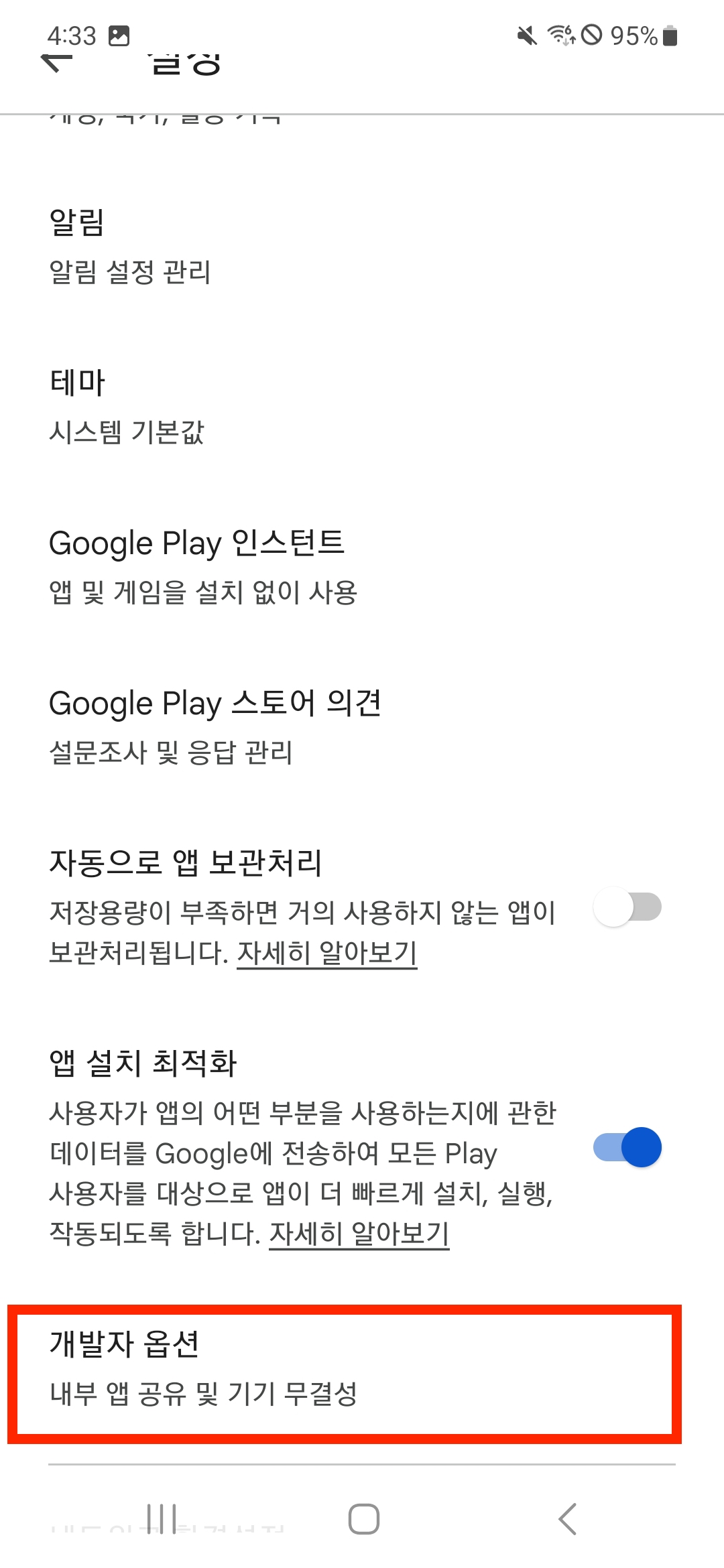 4) Google Play Store 환경 설정 : 개발자 옵션 활성화
