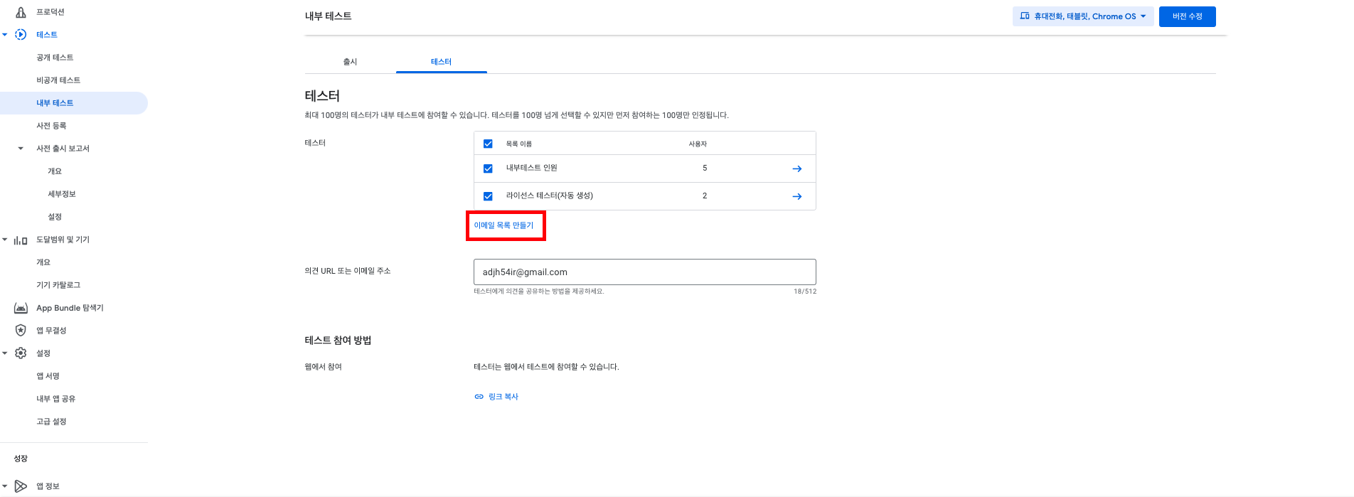 5. 내부 테스트 탭 → 테스터 탭을 이동하여 ‘이메일 목록 만들기’ 버튼을 누릅니다.