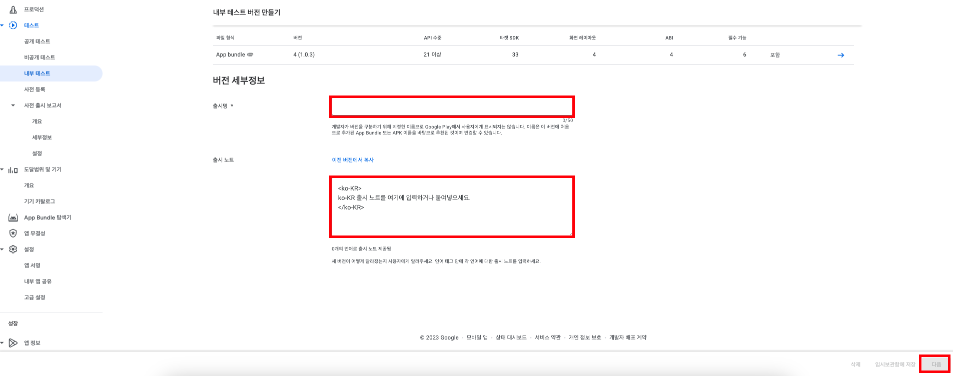 4. 출시명, 출시 노트를 입력하고 ‘저장’ 버튼을 누릅니다.