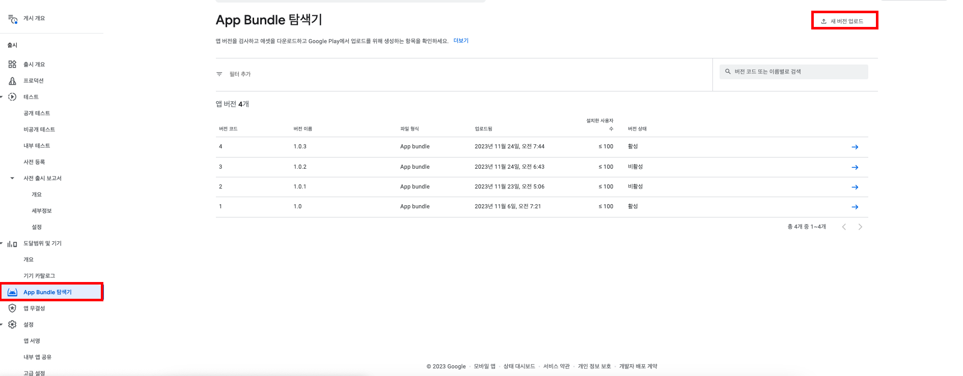 - 기존에 버전이 있다면 , 해당 버전을 사용하면 되고 새로 추가가 필요한 경우 App Bundle 탐색기 → 새 버전 업로드를 누릅니다.