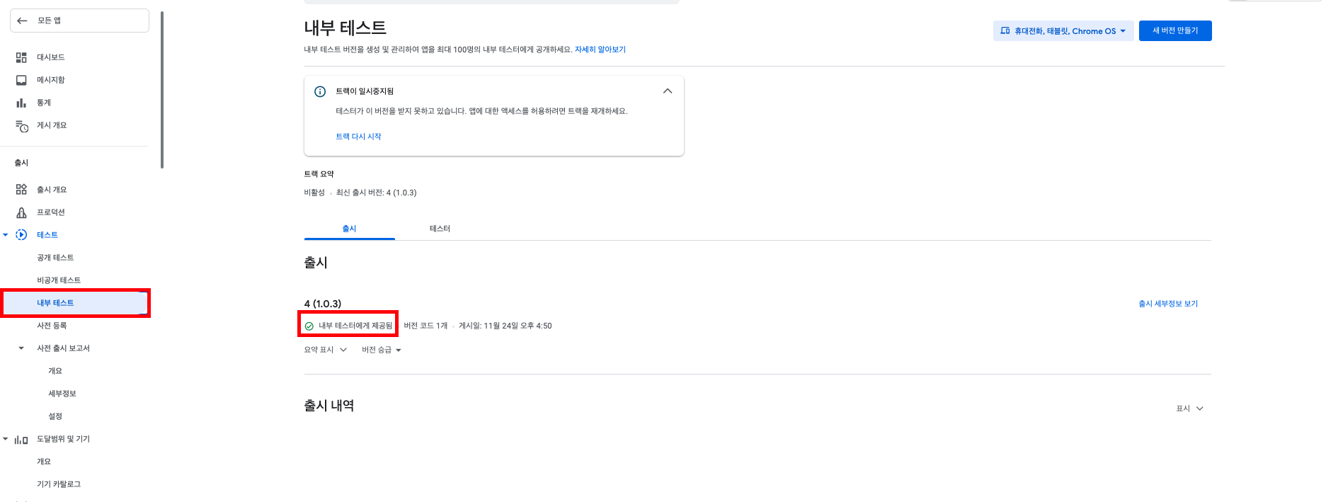 5. 해당 작업은 완료되었고 출시된 앱을 다시 접근하면 ‘내부테스트’에 제외되어 새로운 앱을 받을 수 있음을 확인합니다.