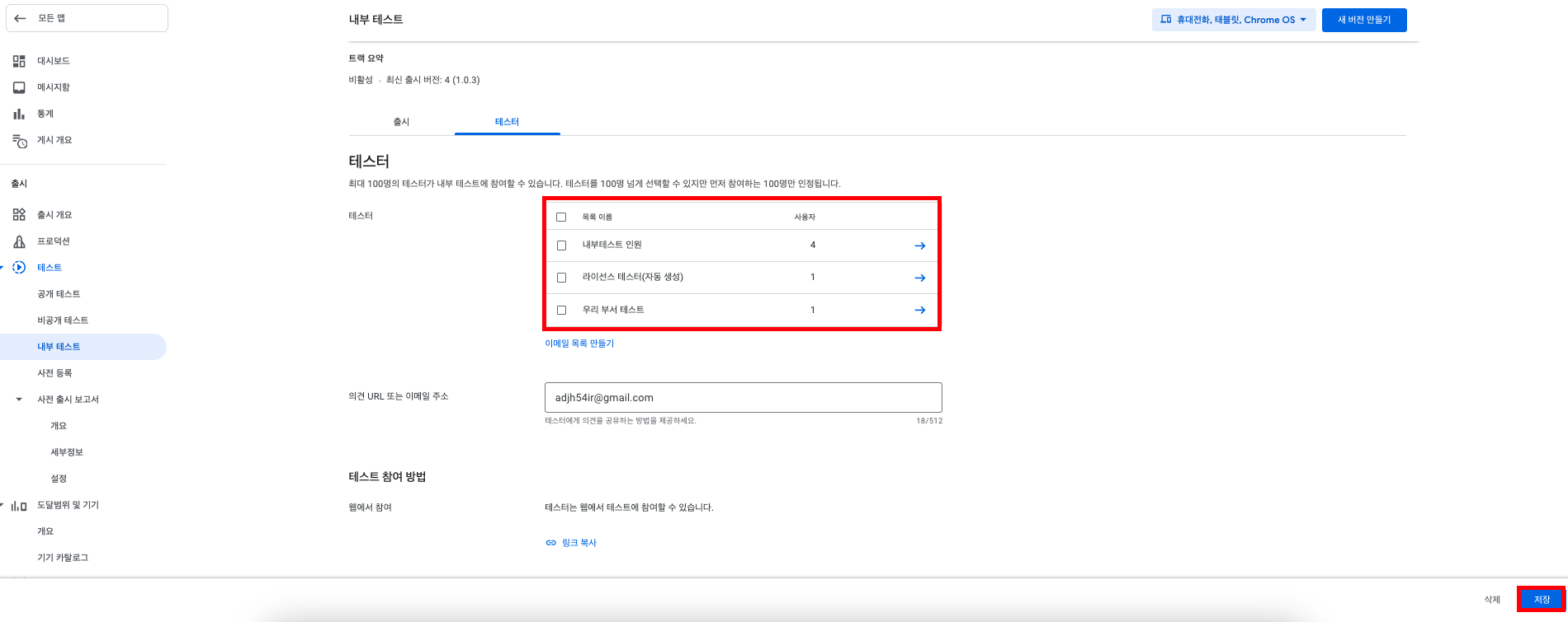 2. 이전 내부 테스터를 제외하고 ‘저장’을 누릅니다.