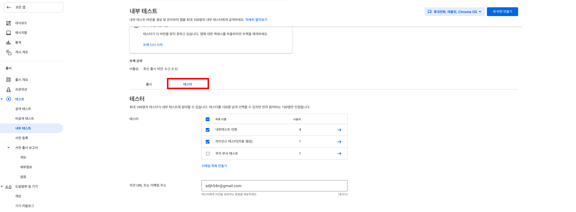 - 즉, 내부 테스트 인원으로 잡혀 있기에 출시된 앱을 다운로드 받을 수 없고 내부 테스트에 대한 앱만 받을 수 있는 문제점이 발생하였습니다.