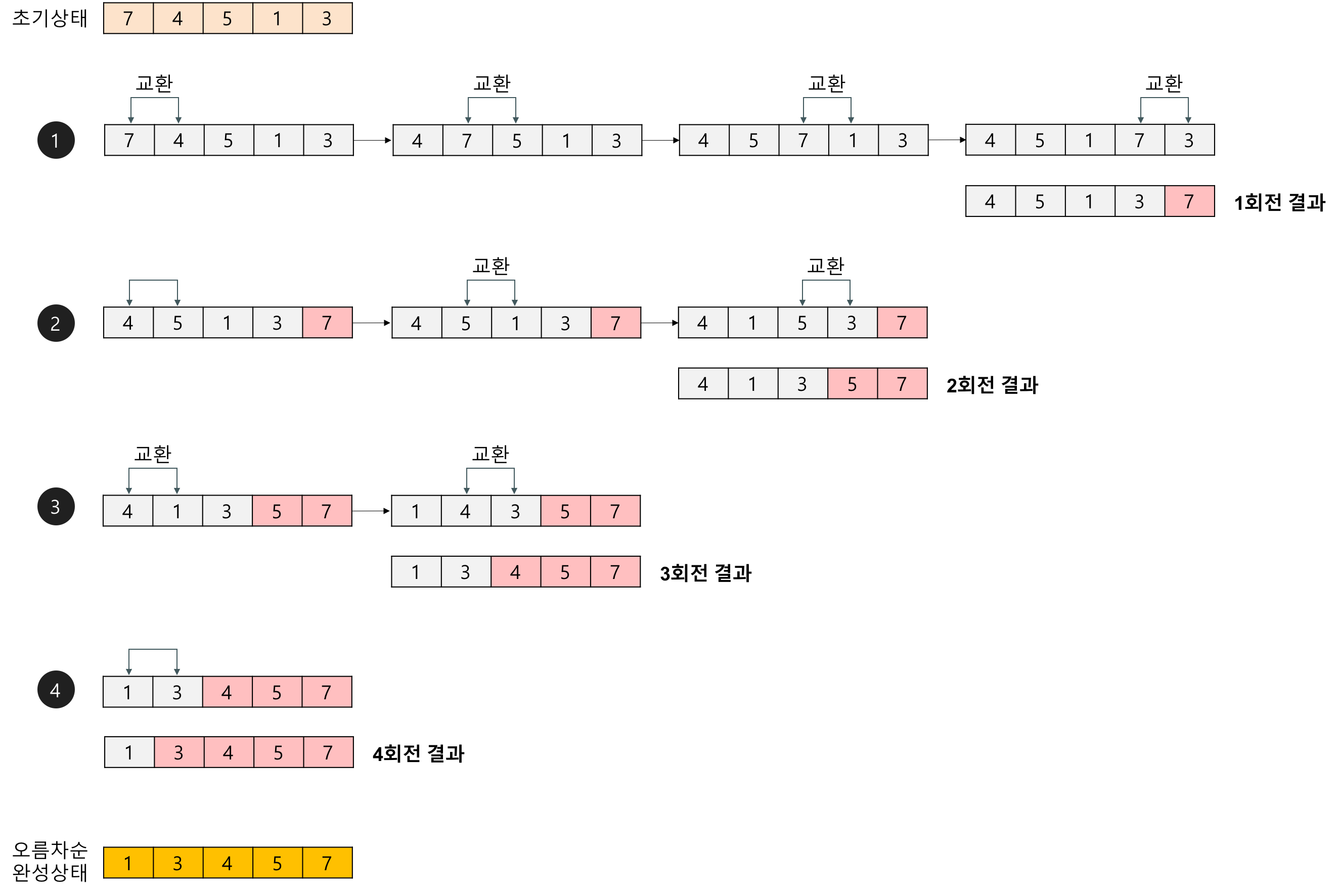 1. 배열에서 가장 작은 요소(최소값)를 찾습니다. 2. 가장 작은 요소와 배열의 첫 번째 요소를 교환합니다. 3. 두 번째로 작은 요소를 찾아 두 번째 요소와 교환합니다. 4. 이러한 과정을 배열의 끝까지 반복합니다.