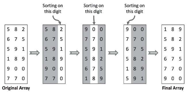 1. 정렬할 요소들을 가장 낮은 자릿수부터 가장 높은 자릿수까지 반복적으로 정렬합니다. 2. 각 자릿수에 대해 요소들을 해당 자릿수의 값에 따라 그룹화합니다. 3. 그룹화된 요소들을 순서대로 다시 배열합니다. 4. 위의 과정을 가장 높은 자릿수까지 반복하여 정렬이 완료될 때까지 진행합니다.