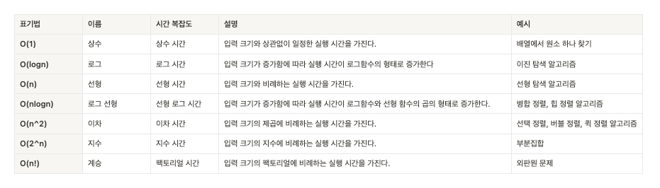 - 알고리즘이 실행될 때 필요한 ‘입력 값’과 ‘연산 수행 시간’에 따라 효율적인 알고리즘을 나타내는 척도를 의미합니다. -즉, 입력 값이 커질수록 알고리즘의 수행 시간이 어떻게 증가하는지에 따른 지표입니다. 시간 복잡도는 ‘빅오 표기법(Big-O notation)’를 통해 표현하며 수치가 작을수록 효율적인 알고리즘을 의미합니다.