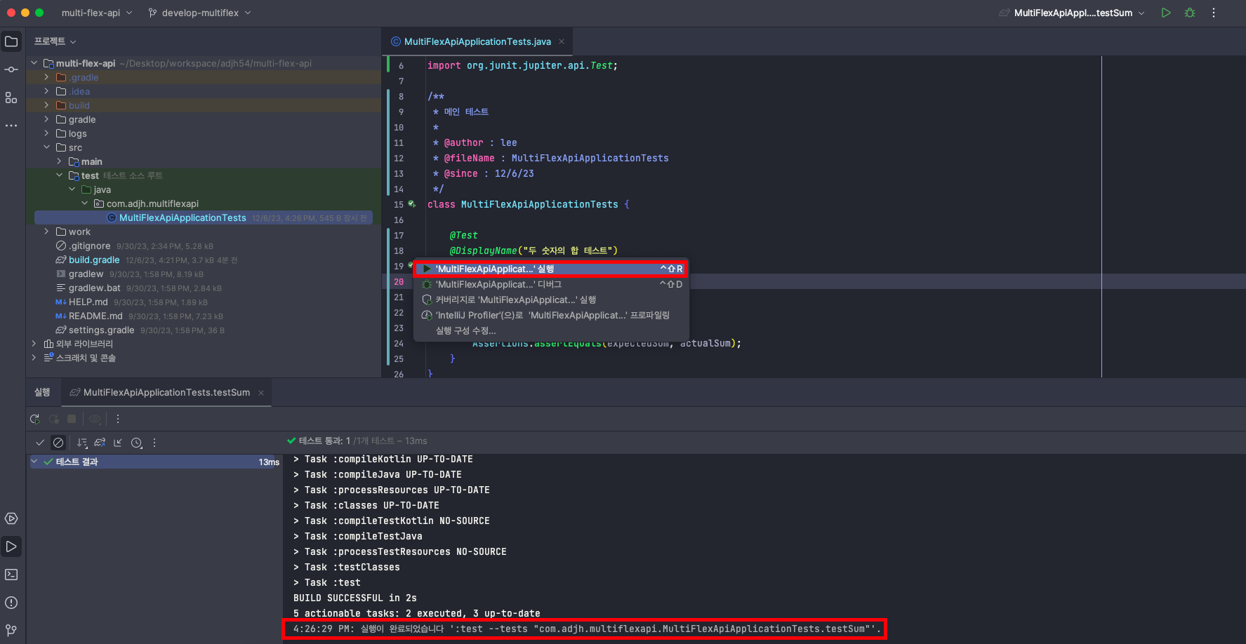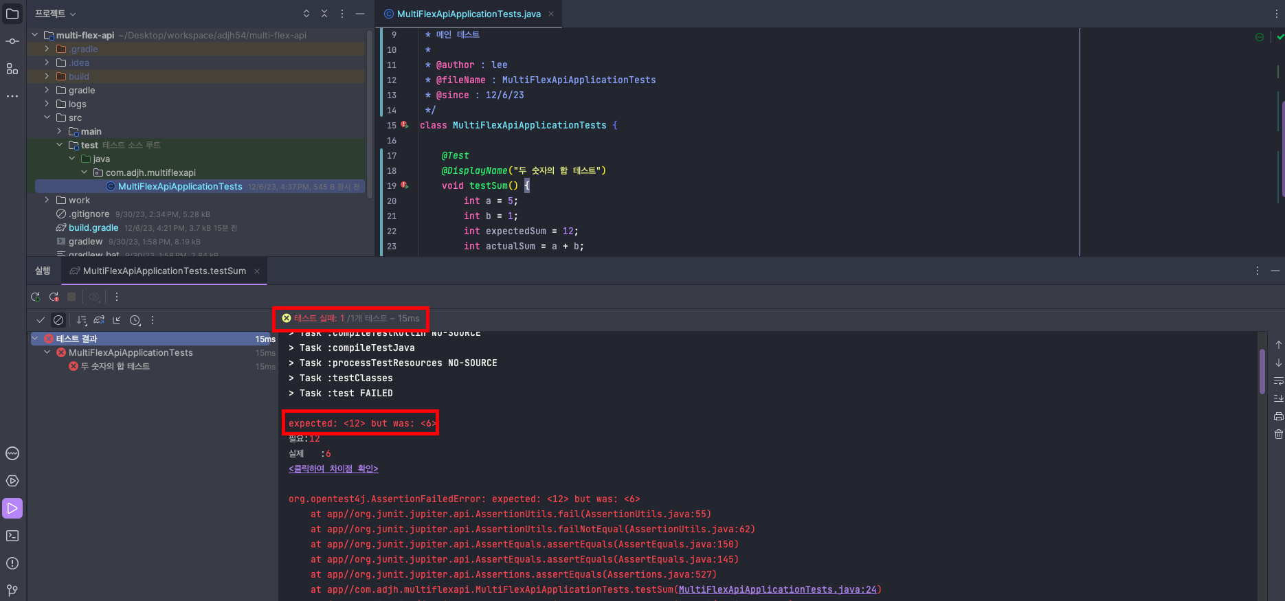 - 해당 테스트에서는 두 숫자의 합이 맞는지 여부를 확인하는 테스트를 구성하였습니다. - a + b의 값과 expectedSum값을 비교했을 때 해당 결과값이 맞는지에 대해 확인합니다.