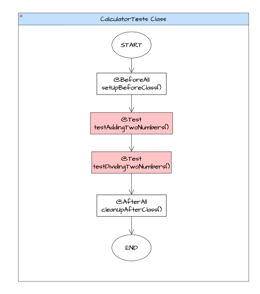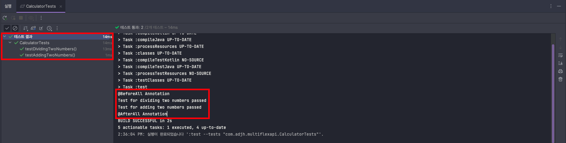 - 시작 전후에 @BeforAll, @AfterAll로 지정한 메서드가 실행이 되었습니다. - @Test로 지정한 testAddingTwoNumbers(), testDividingTwoNumbers() 함수가 실행이 되었습니다.