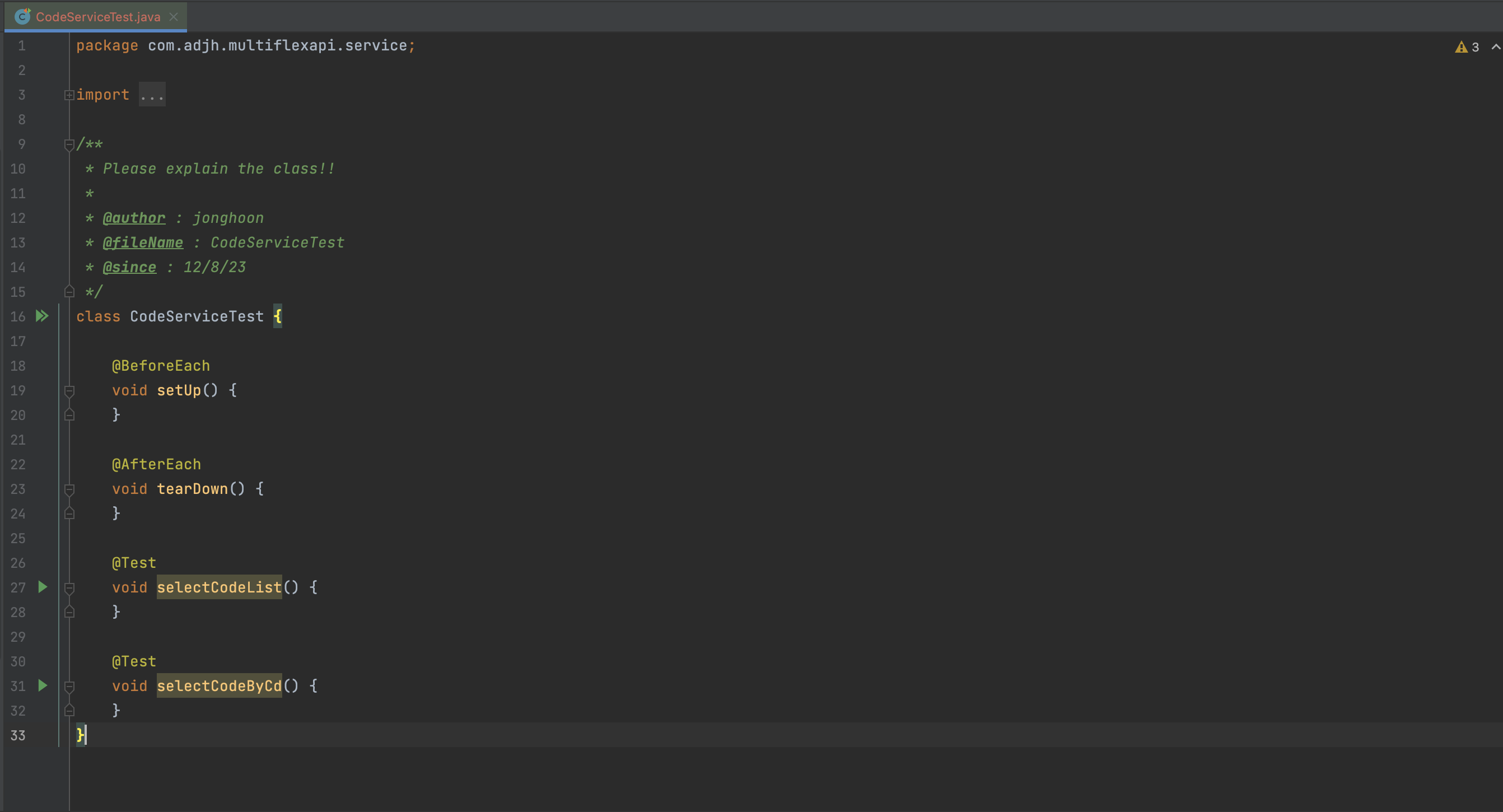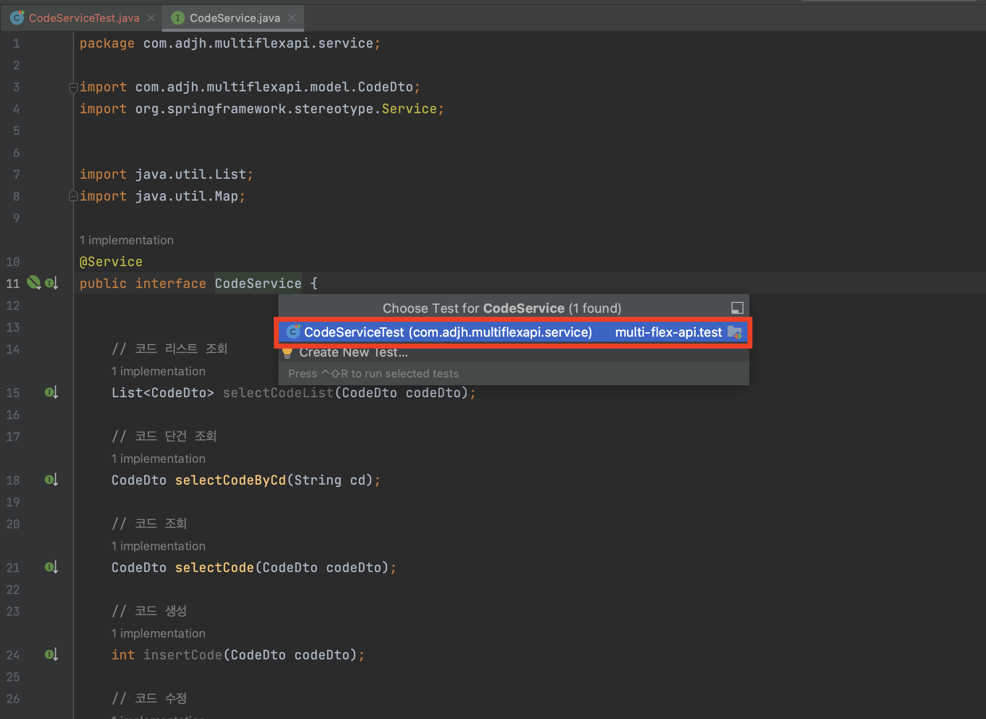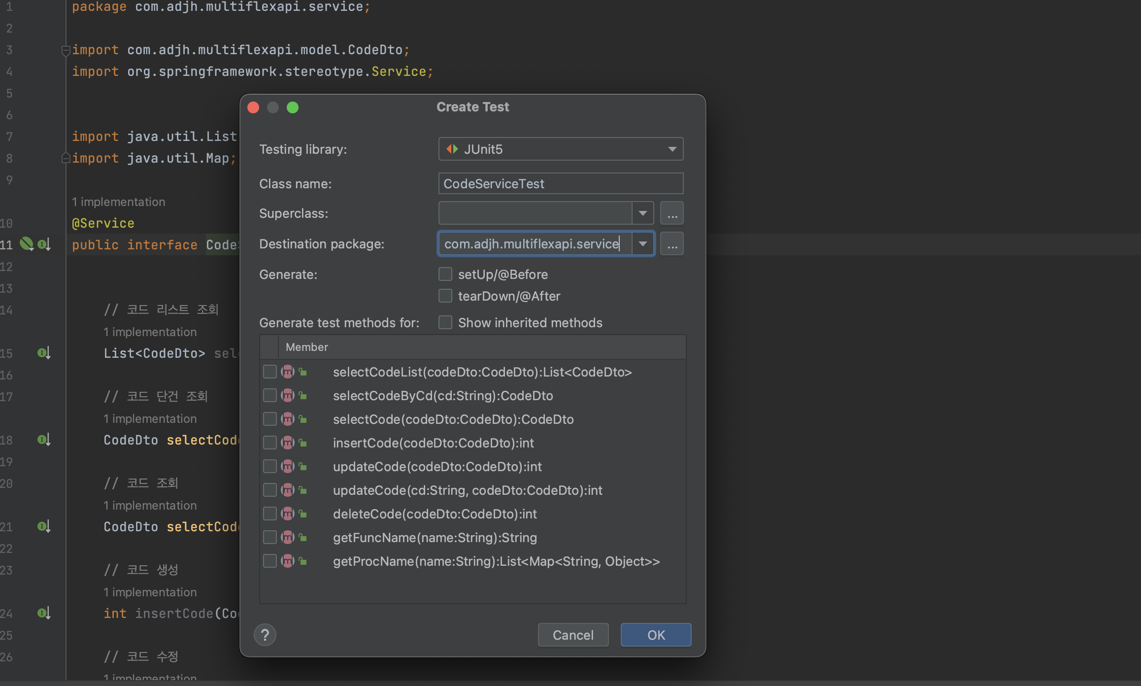 - 해당 코드에서는 CodeService를 주입받아서 값을 구성하여 서비스를 호출하는 테스트를 구성하였습니다.