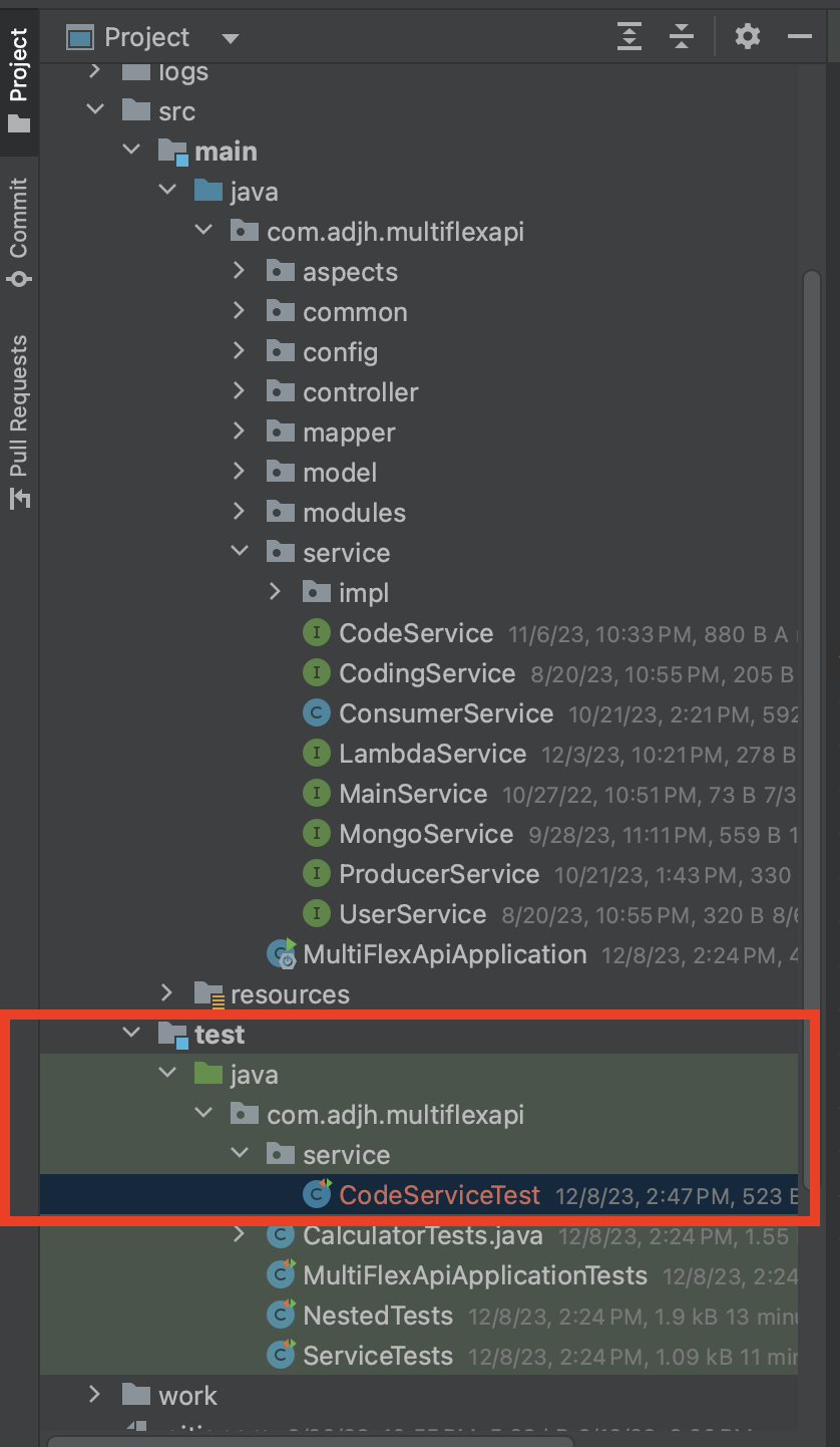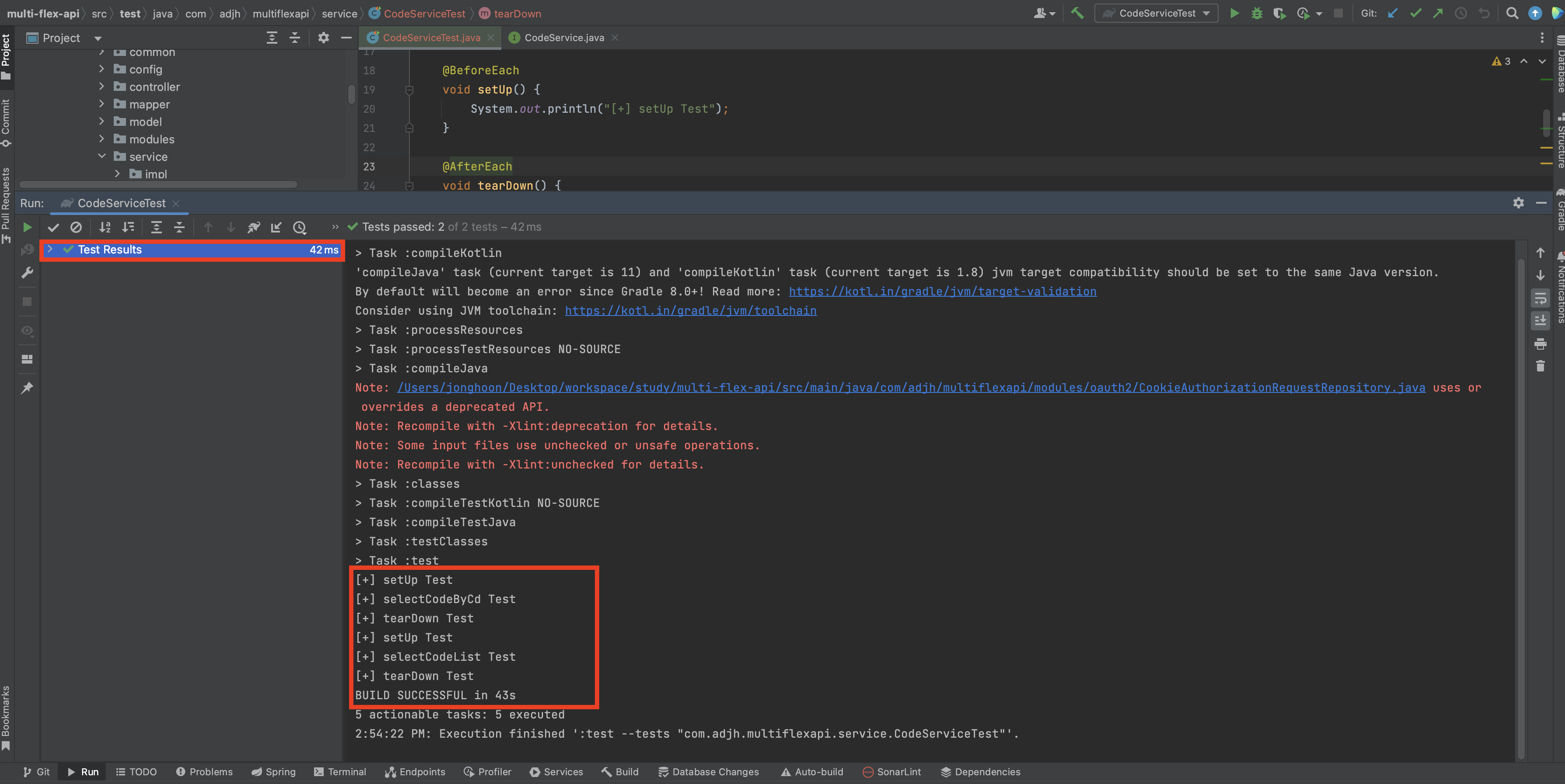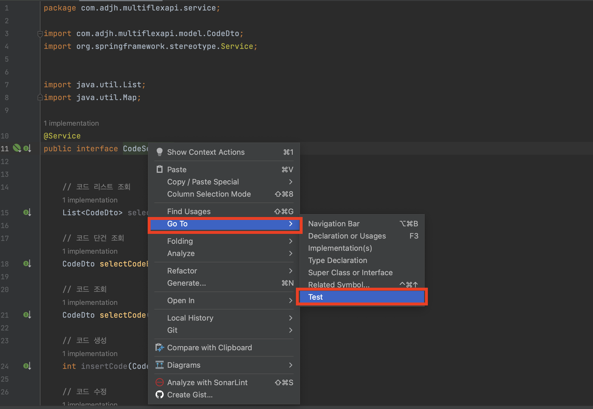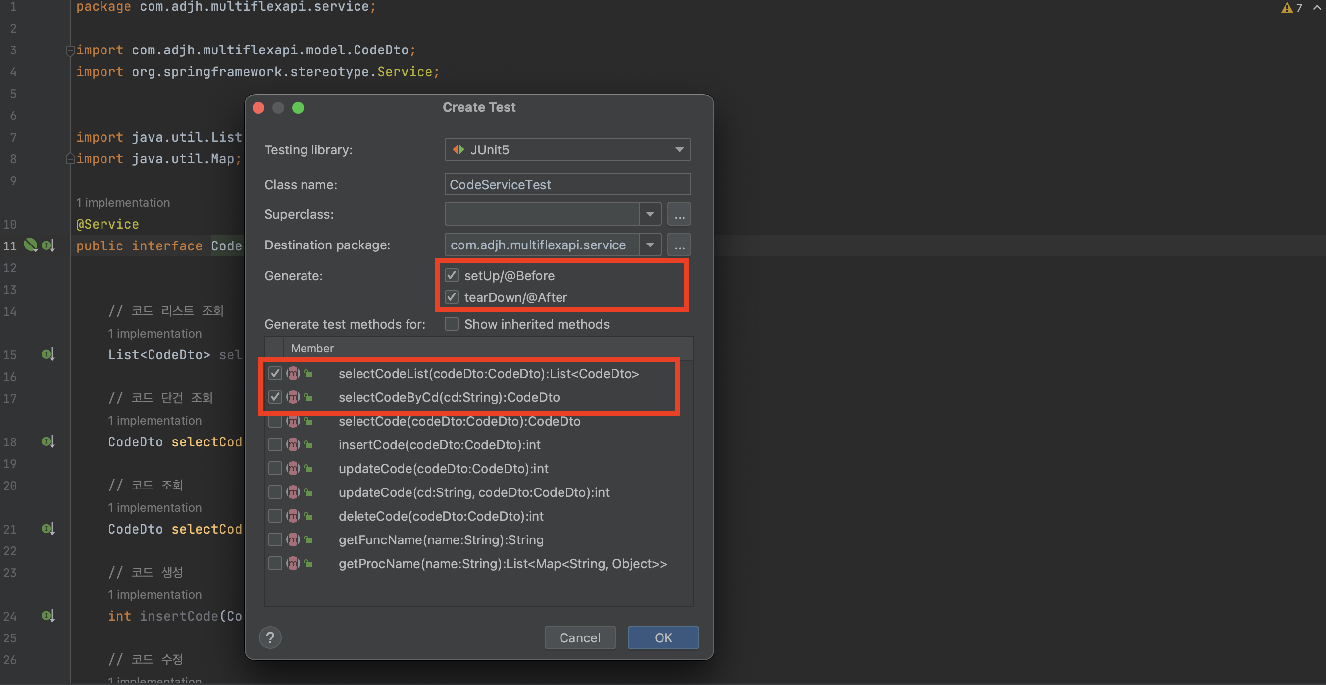 - 해당 코드에서는 CodeService를 주입받아서 값을 구성하여 서비스를 호출하는 테스트를 구성하였습니다.