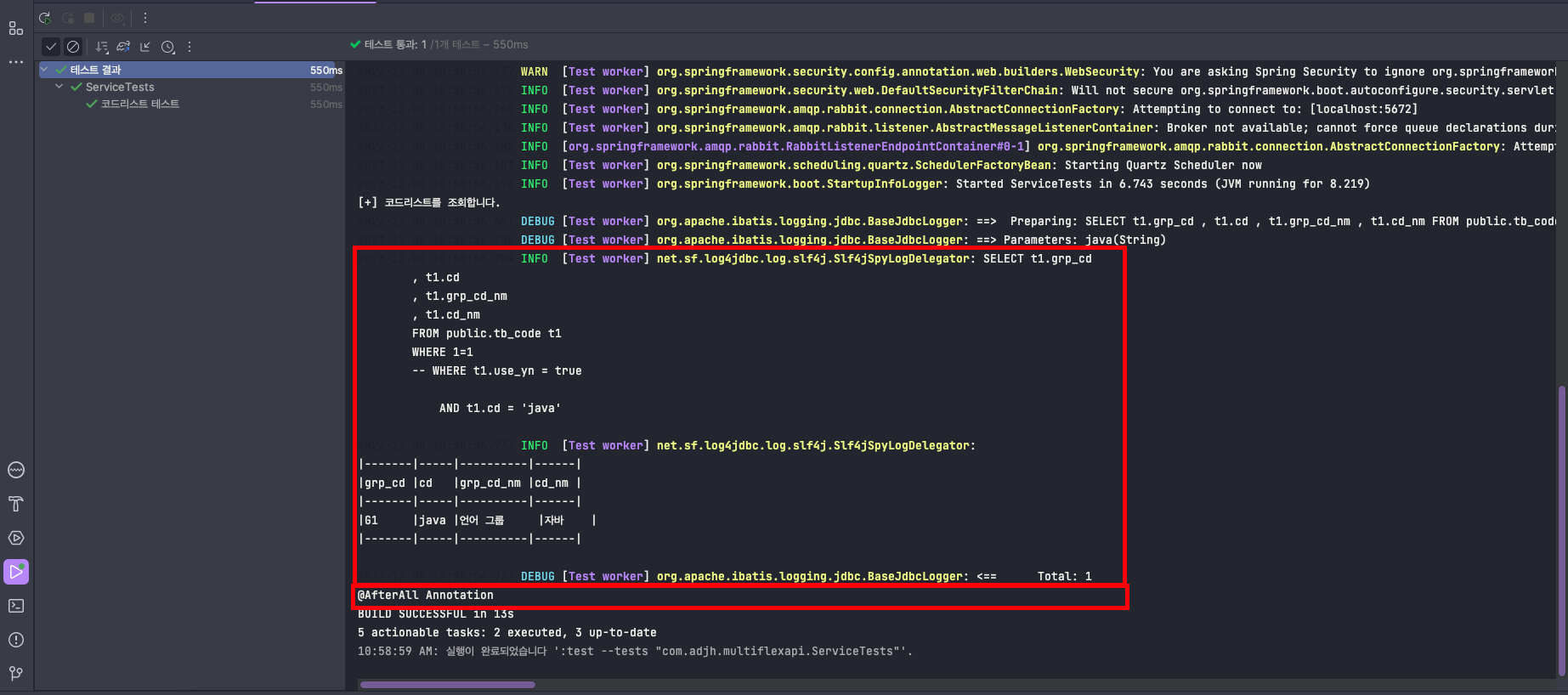 8. 최종 테스트 종료 이전에 @AfterAll 어노테이션을 통해 cleanUpAfterClass() 함수가 수행됩니다.
