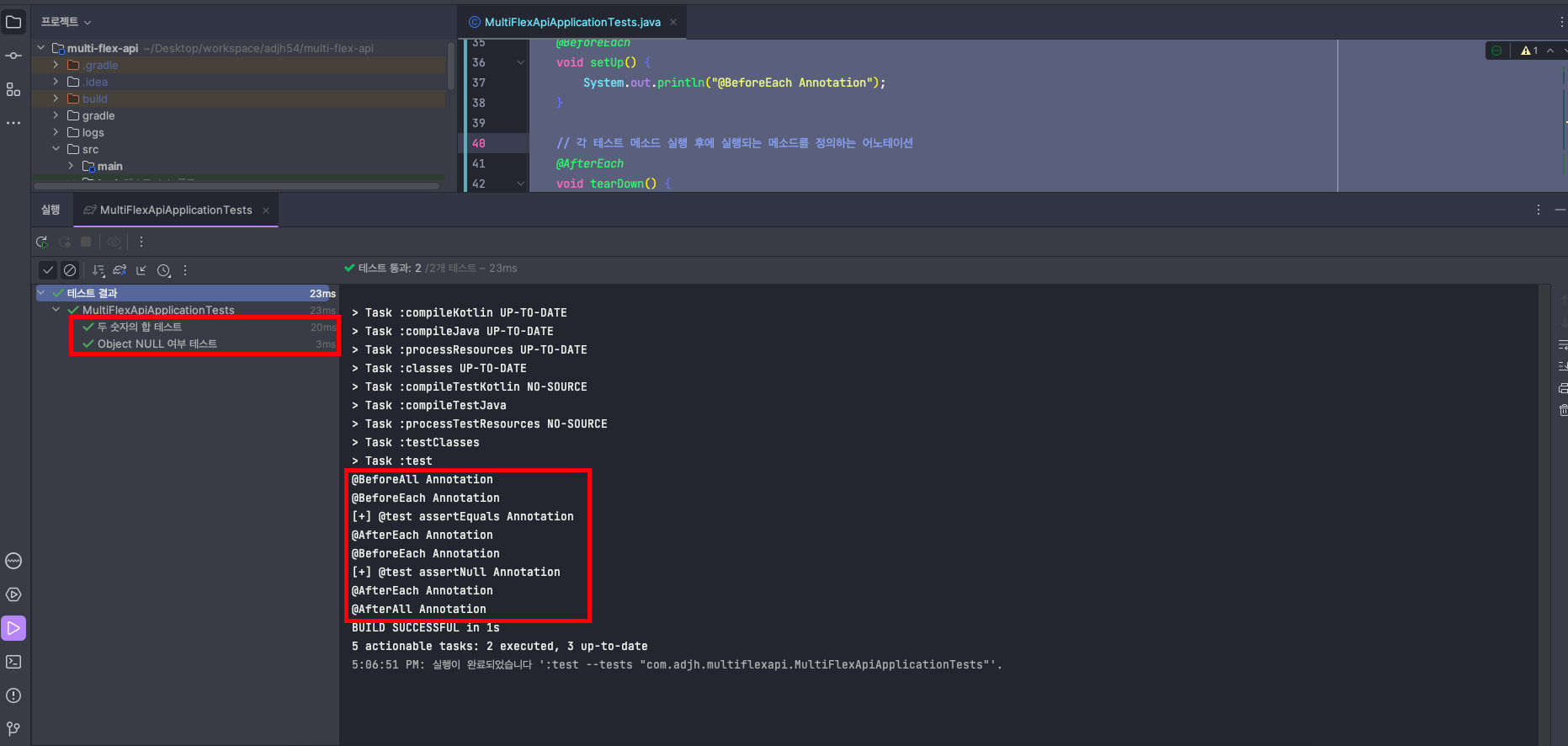 - @Test로 구성한 두 개의 메서드가 성공적으로 수행되었습니다. - @BeforeAll, @AfterAll의 경우는 테스트의 시작 전후에 한 번씩만 수행되었고@BeforeEach, @AfterEach의 경우는 @Test로 구성한 메서드의 전후에 각각 수행이 되었습니다.