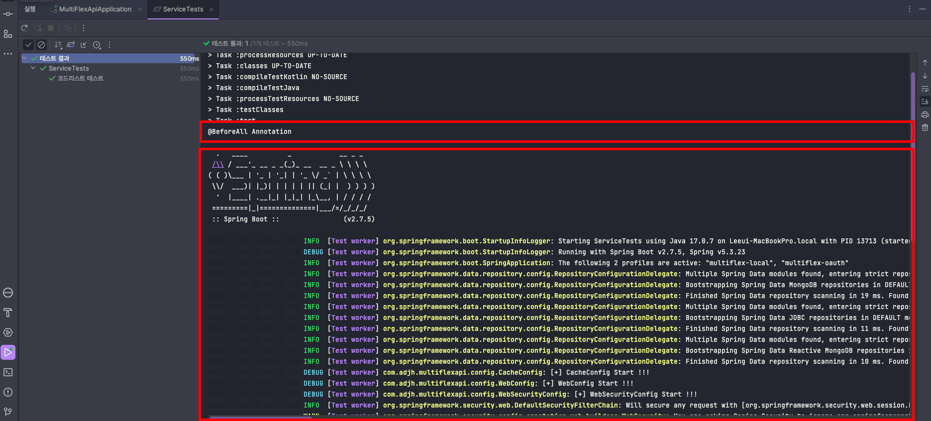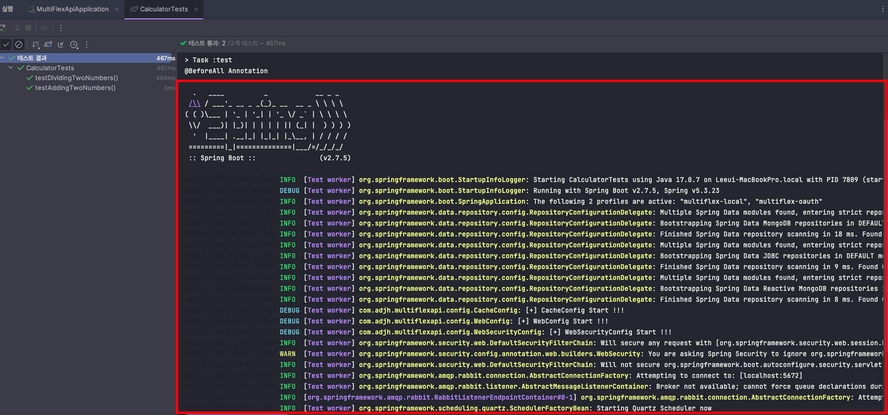 💡 클래스에 @SpringBootTest 어노테이션을 선언하면 @Test을 수행하면서 아래와 같이 로컬 서버가 수행되면서 테스트가 진행되는 것을 확인할 수 있습니다.
