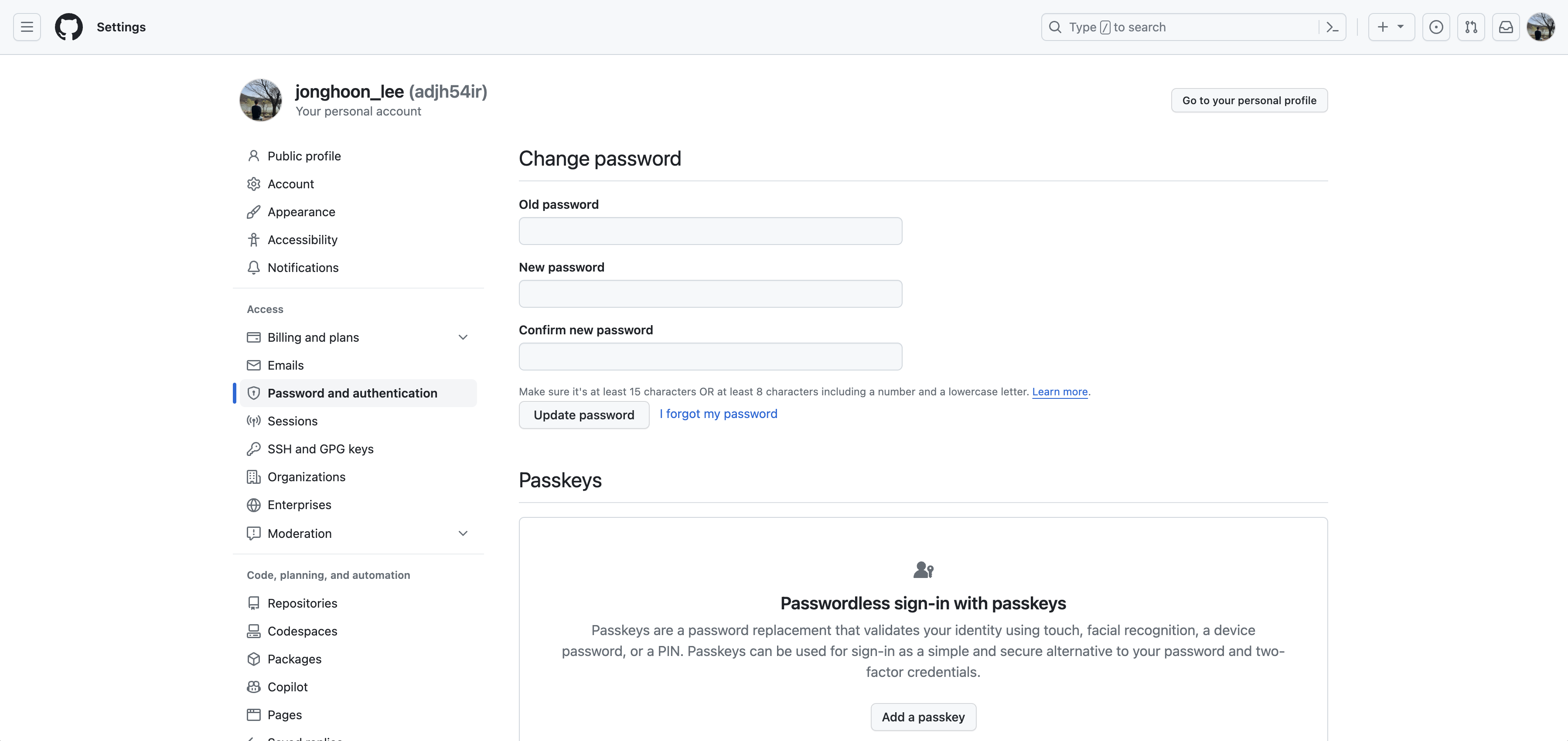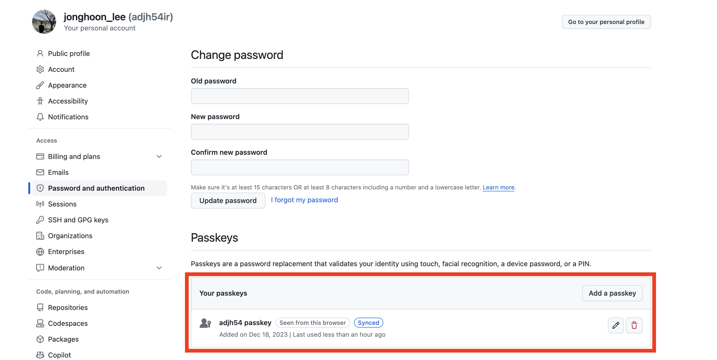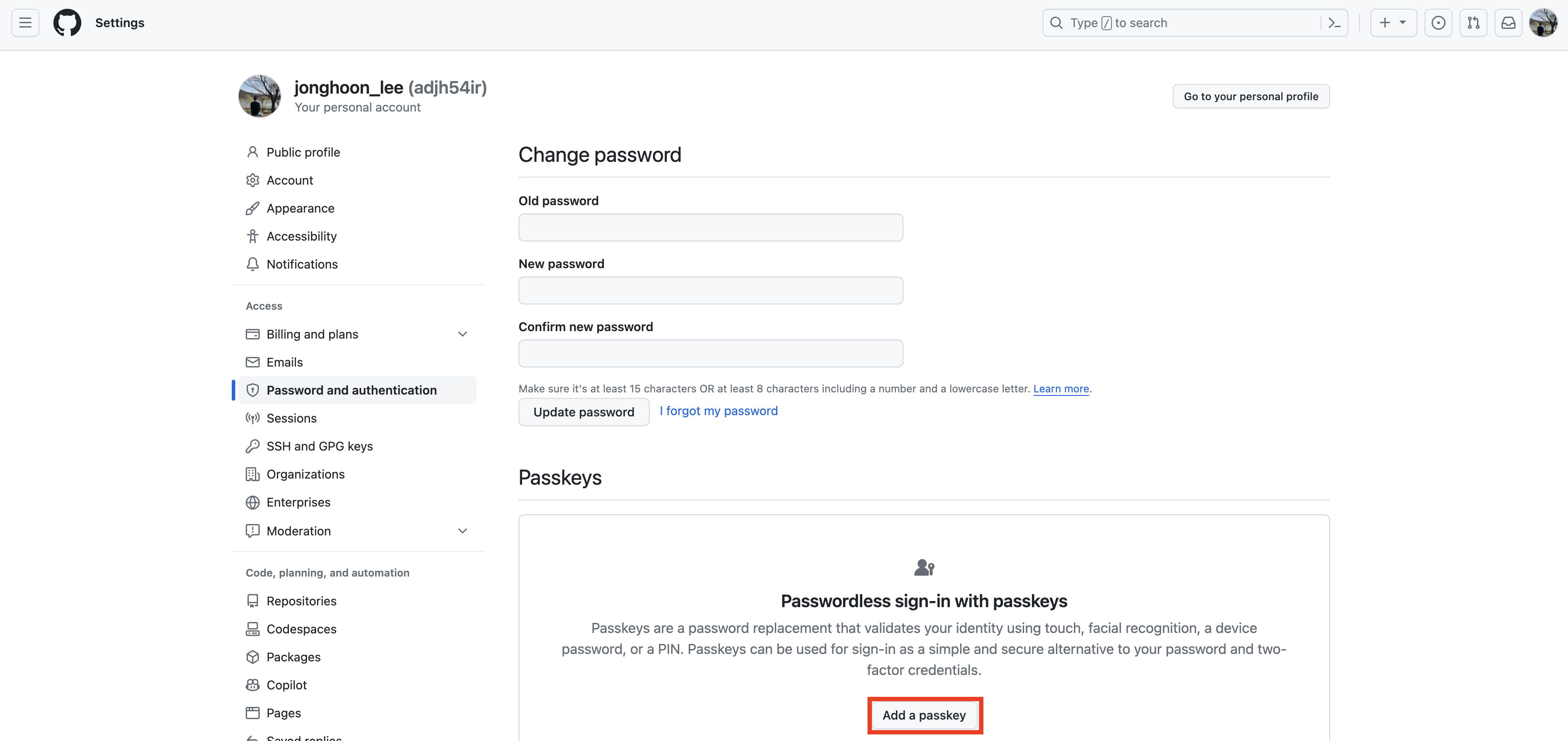 2. Settings - Password and authentication 탭을 선택하고 ‘Add a passkey’ 버튼을 누릅니다.
