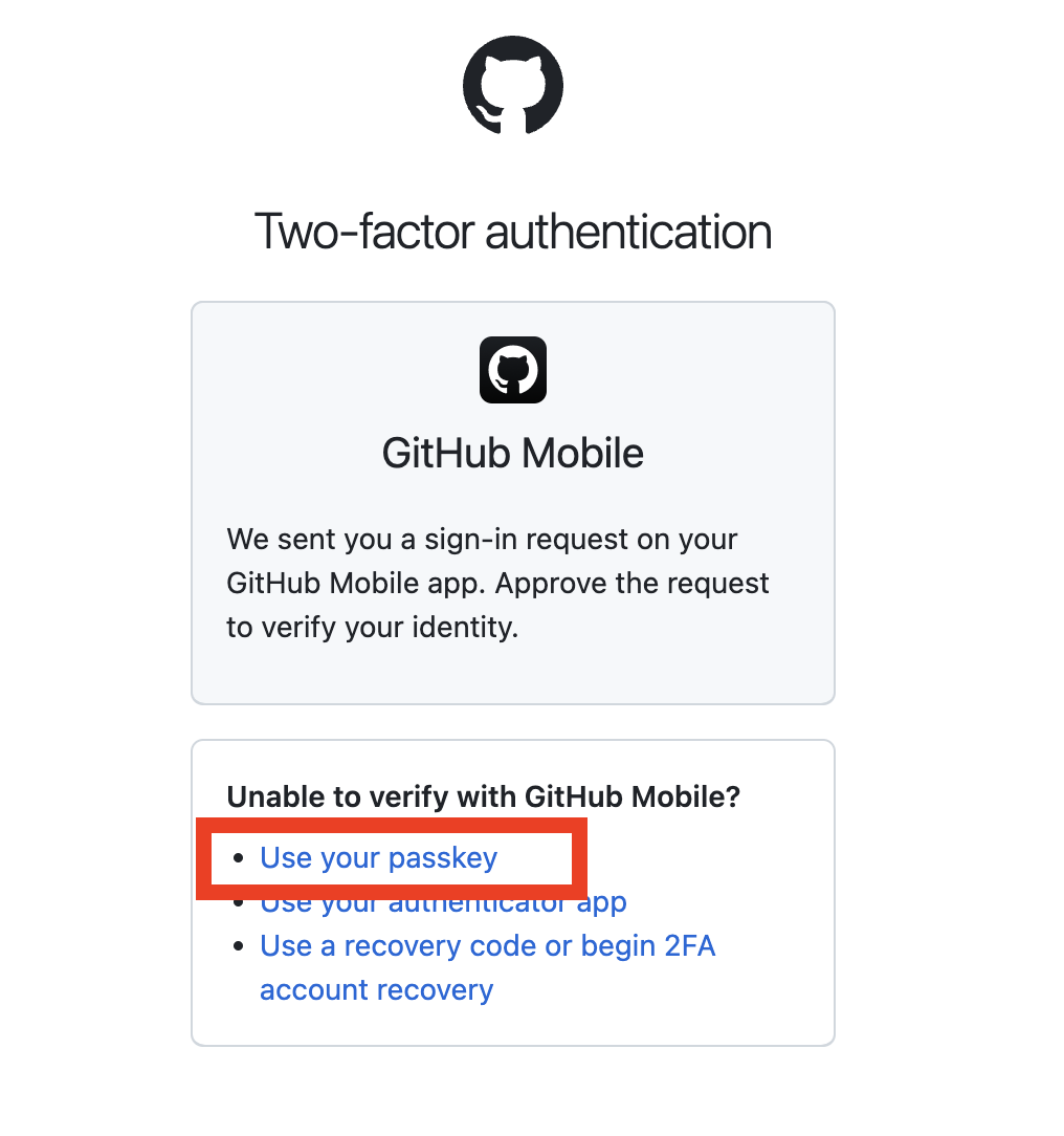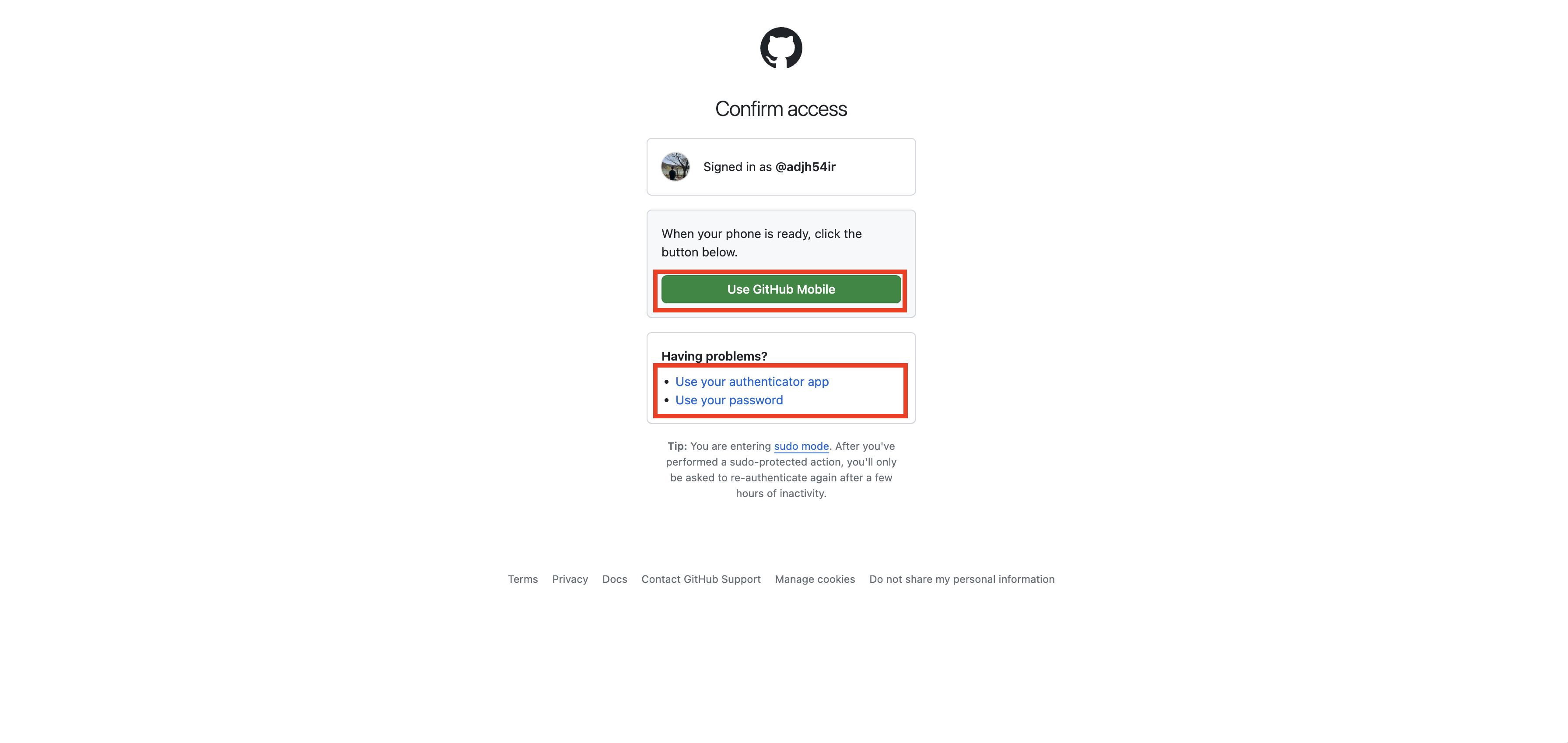3. Use Github Mobile로 인증을 하거나 Authenticator app 혹은 Use your password를 통해 1차 인증을 거칩니다.
