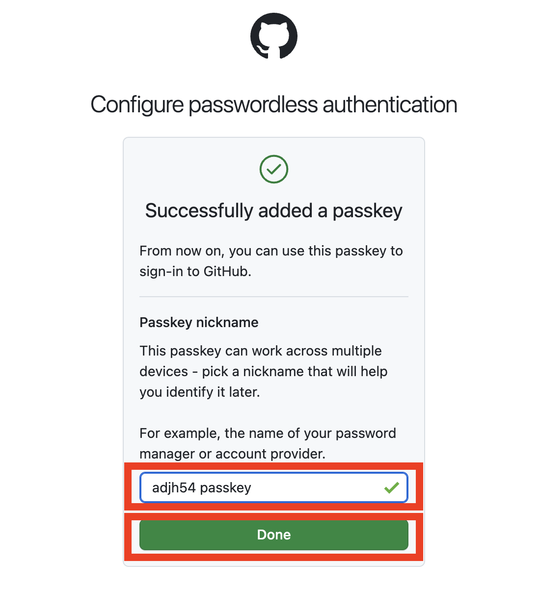 7. Passkey의 닉네임을 입력하고 ‘Done’ 버튼을 누르면 완료됩니다.