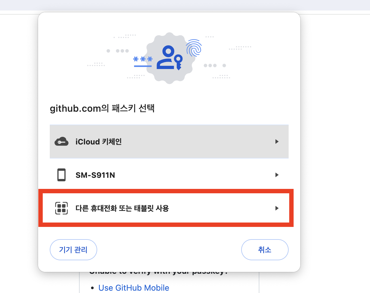 💡 저는 QR 코드 인증방법으로 간단하게 인증을 하기 위해 ‘다른 휴대전화, 태블릿 또는 보안 키 사용’ 탭을 선택하였습니다.