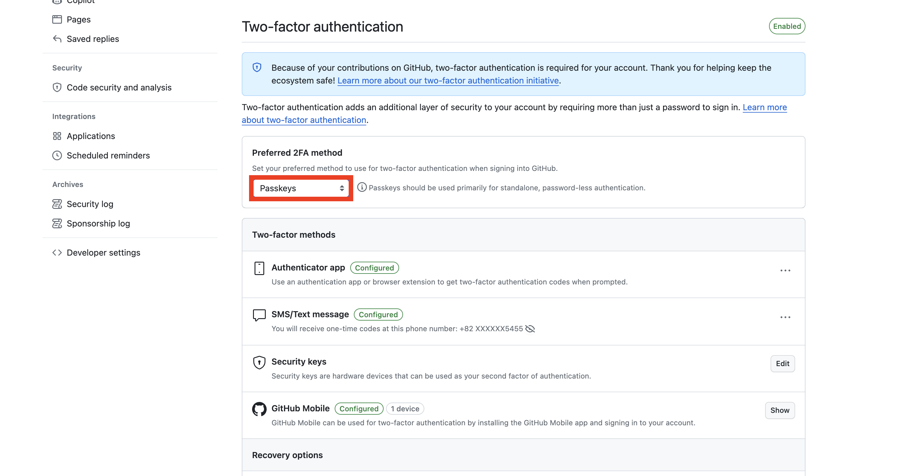 9. 이전 화면에서 좀 더 아래로 내려서 2단계 인증방식으로 passkey를 선택합니다.
