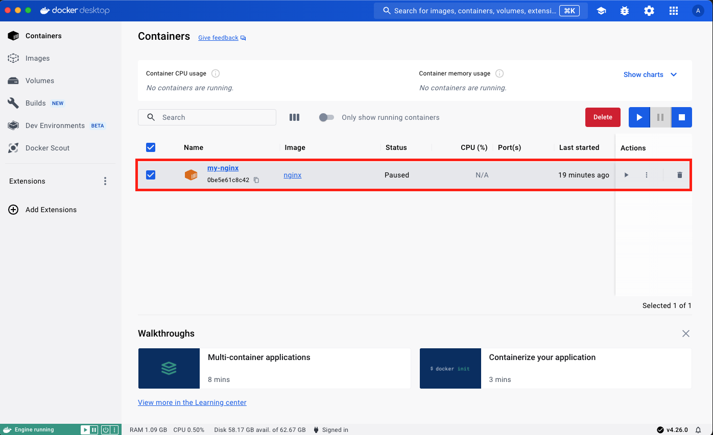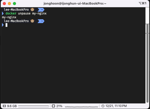 💡 컨테이너 재개 (Unpause Container) - 일시 정시된 컨테이너를 다시 시작합니다. - 컨테이너는 일시 정지된 상태에서 멈춘 지점부터 계속 실행합니다.