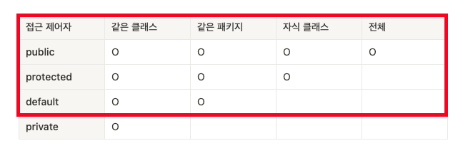 - 아래의 표와 같이 같은 클래스, 같은 패키지에 있는 경우 접근이 허용되는 경우는 public만 가능함을 확인하였습니다.