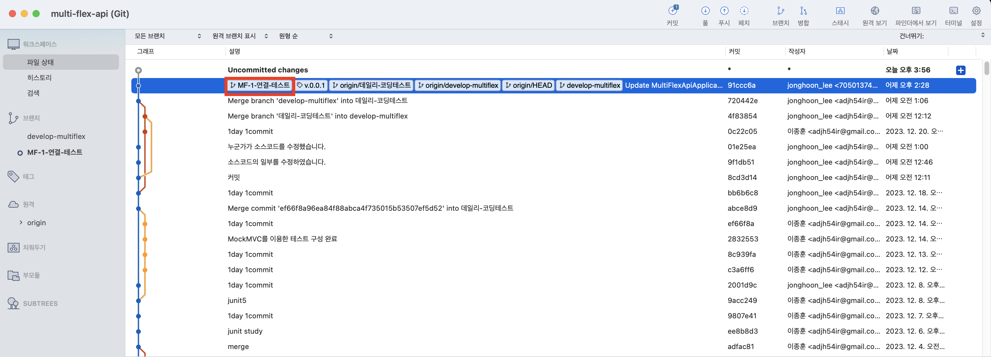 💡 JIRA에서 생성한 이슈별로 이슈의 키 값을 기반으로 ‘MF-1 연결 테스트’라는 feature branch를 생성하였습니다.