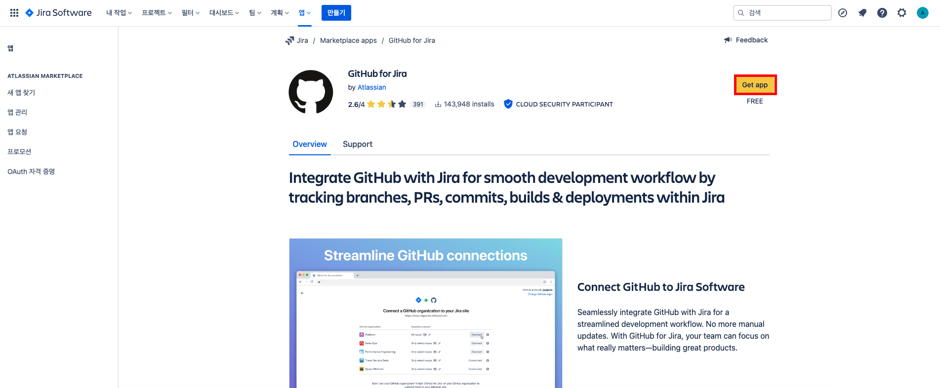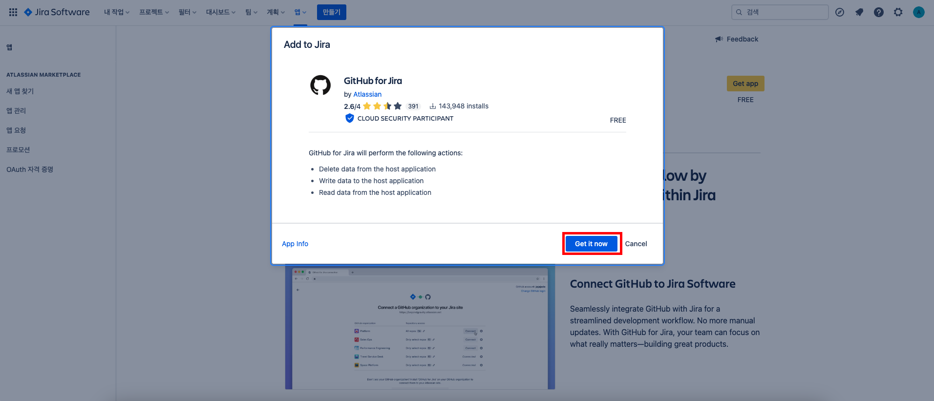 4. Add to Jira 팝업 내에서 ‘Get it now’ 버튼을 누릅니다.