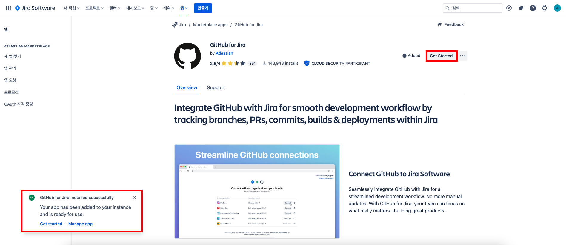 5. Github for Jira installed successfully 팝업으로 추가가 완료되었고 ‘Get Started’ 버튼을 누릅니다.