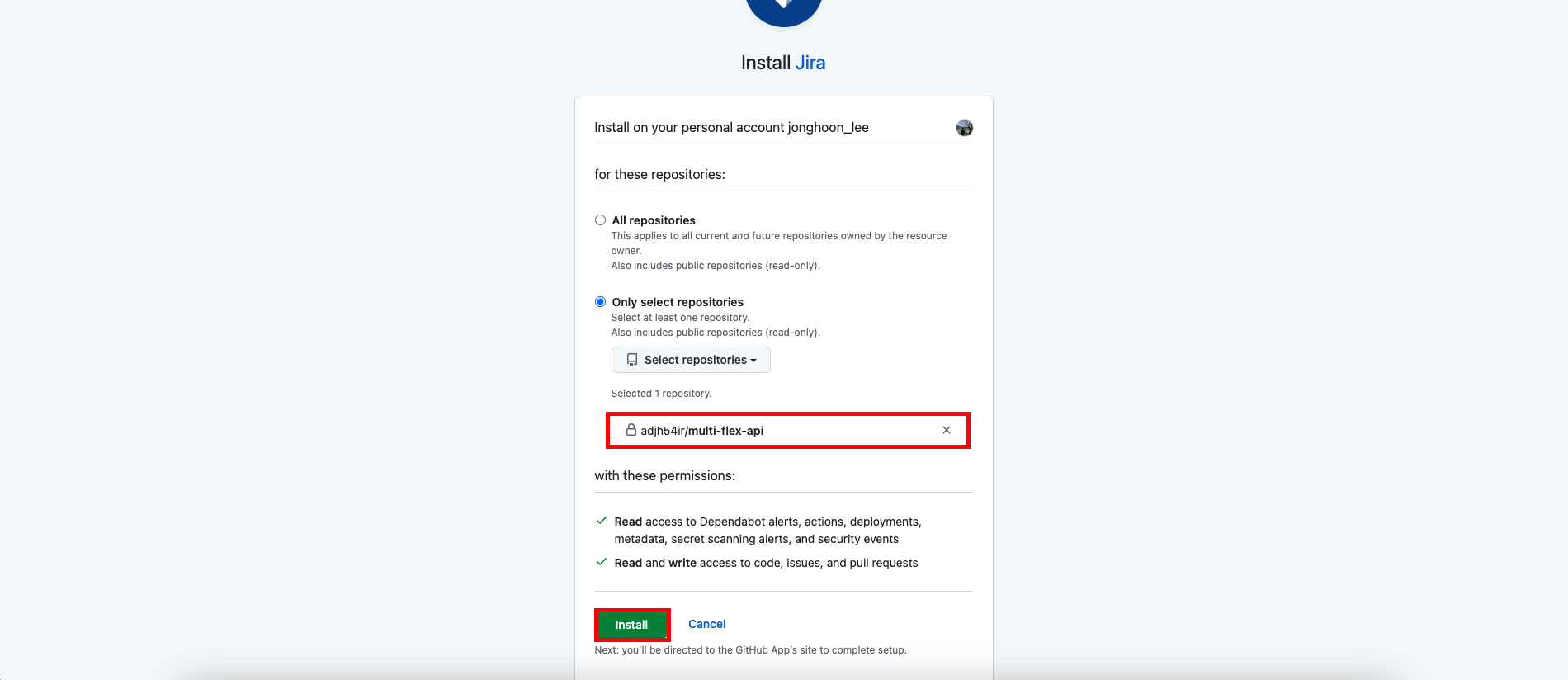 10. Only select repositories를 통해 일부 repository만 연결하도록 구성합니다.