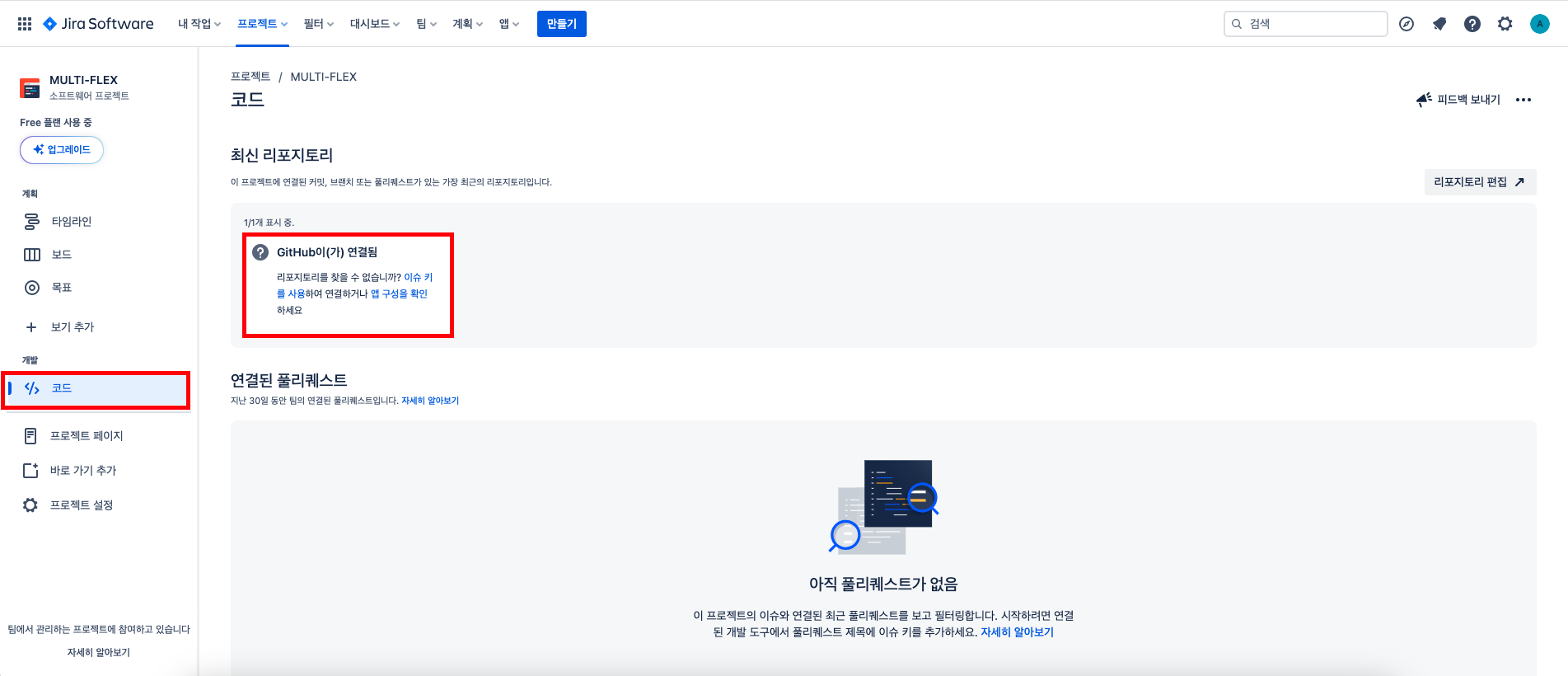 14. JIRA에서 ‘코드’ 탭을 확인하면 아래와 같이 연결됨을 확인할 수 있습니다.