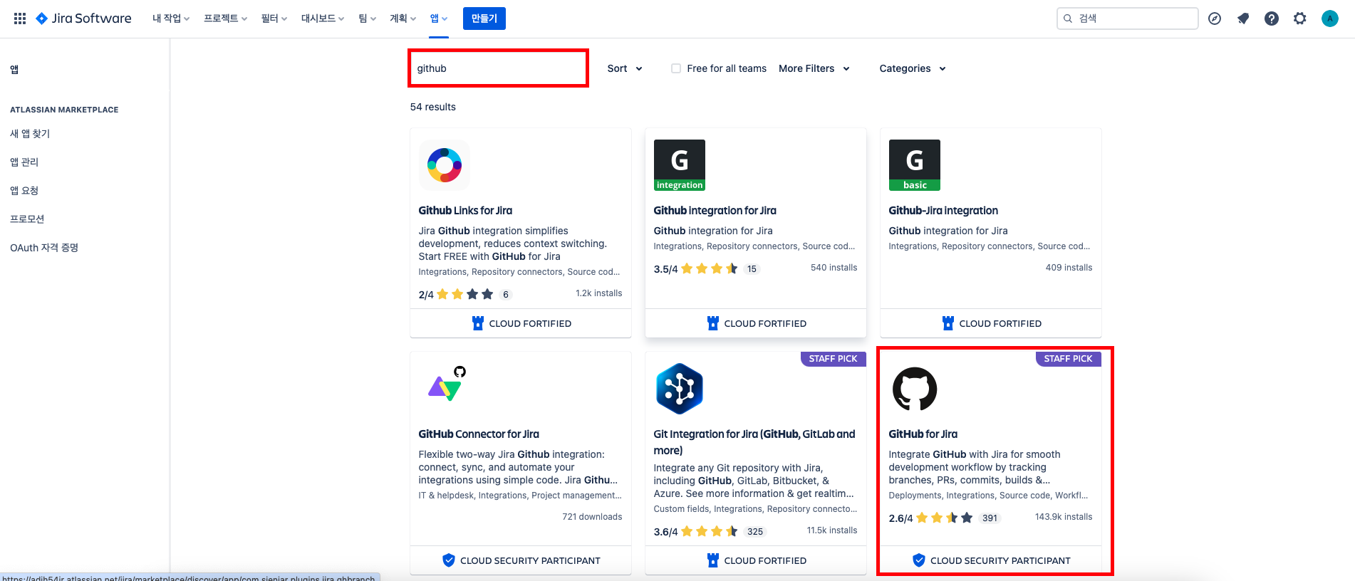 2. 앱에서 ‘github’를 검색하여 ‘Github for Jira’를 선택합니다.