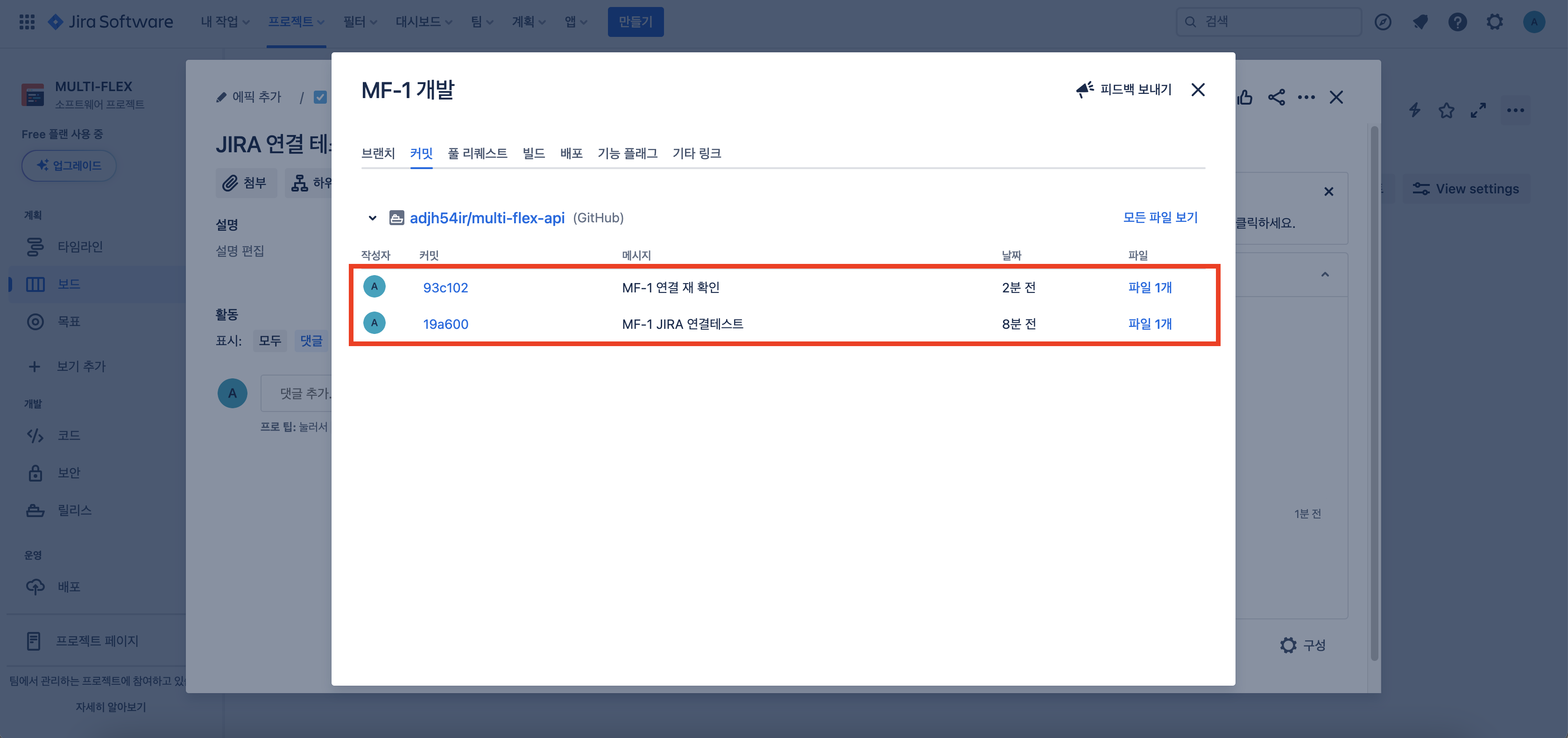 5. 해당 JIRA를 확인하면 2개의 커밋으로 ‘키 값’을 기반으로 커밋한 내용에 대해 변경사항이 추가됨을 확인할 수 있습니다.