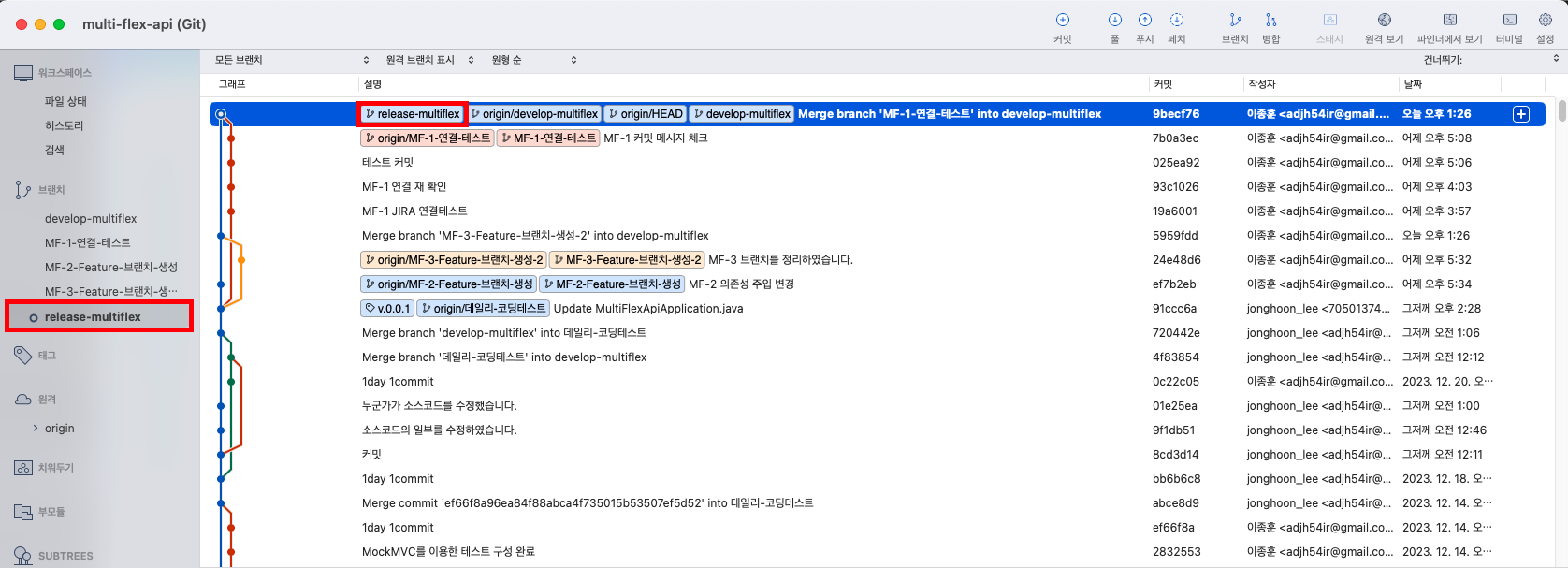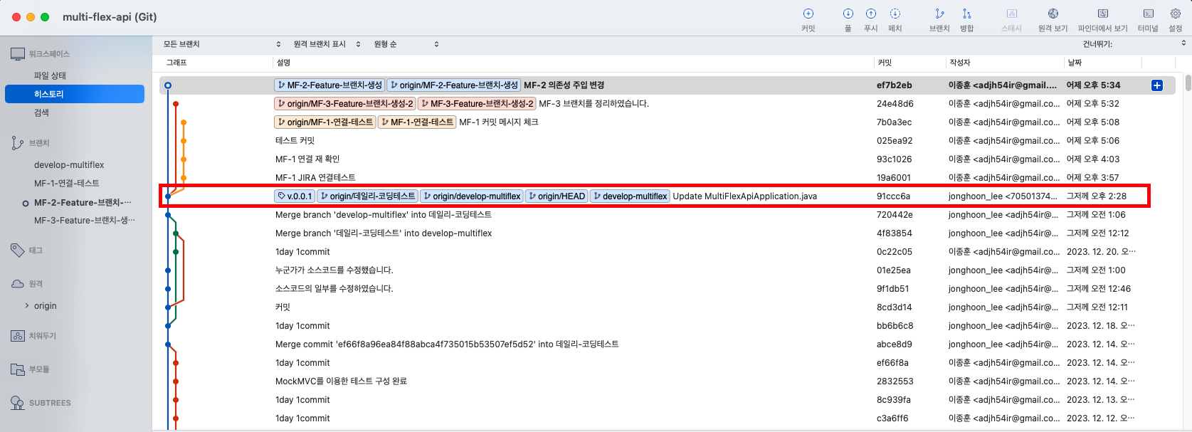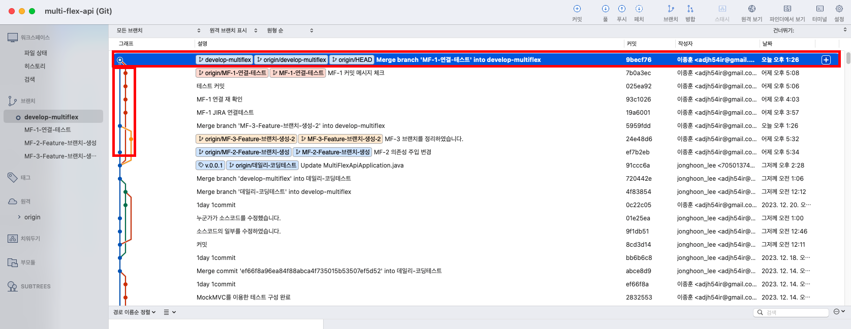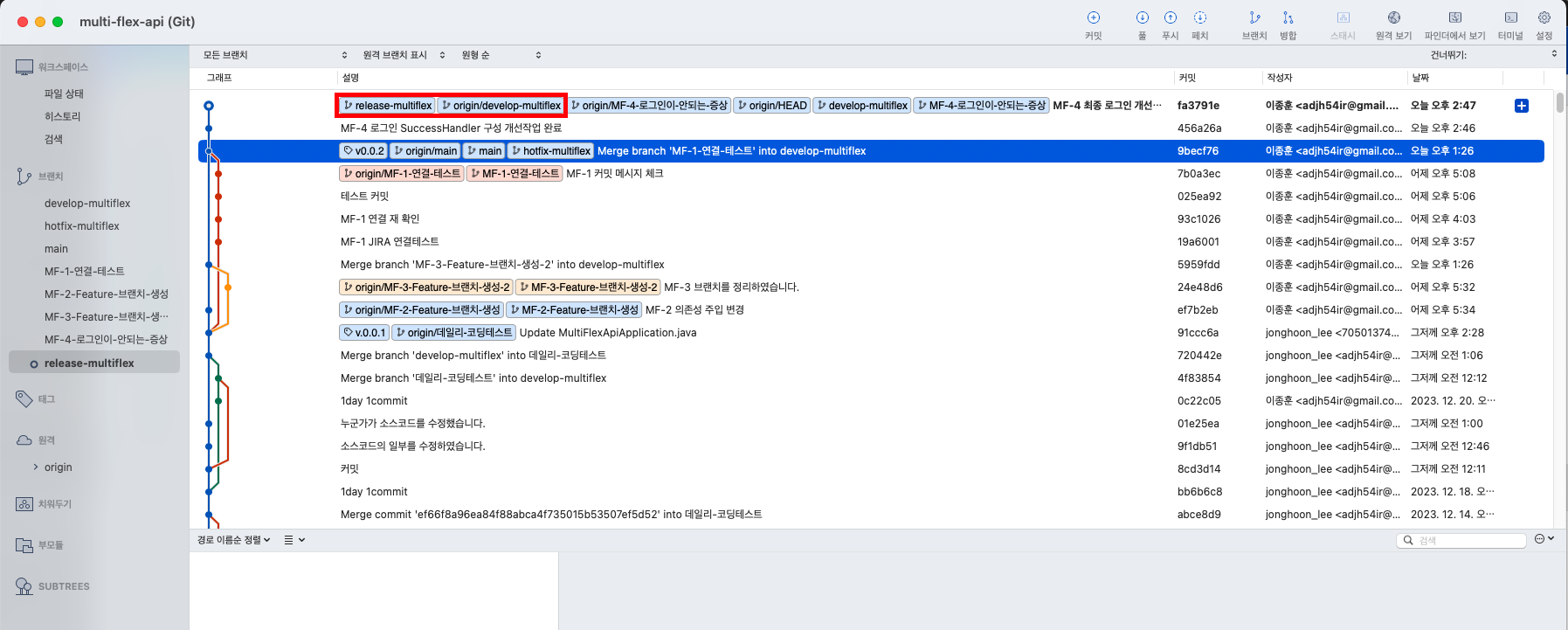 - 아래의 예시에서는 MF-1, MF-2, MF-3 이슈들에 대해서 ‘develop-multiflex’라는 Develop Branch에 병합을 하였습니다.