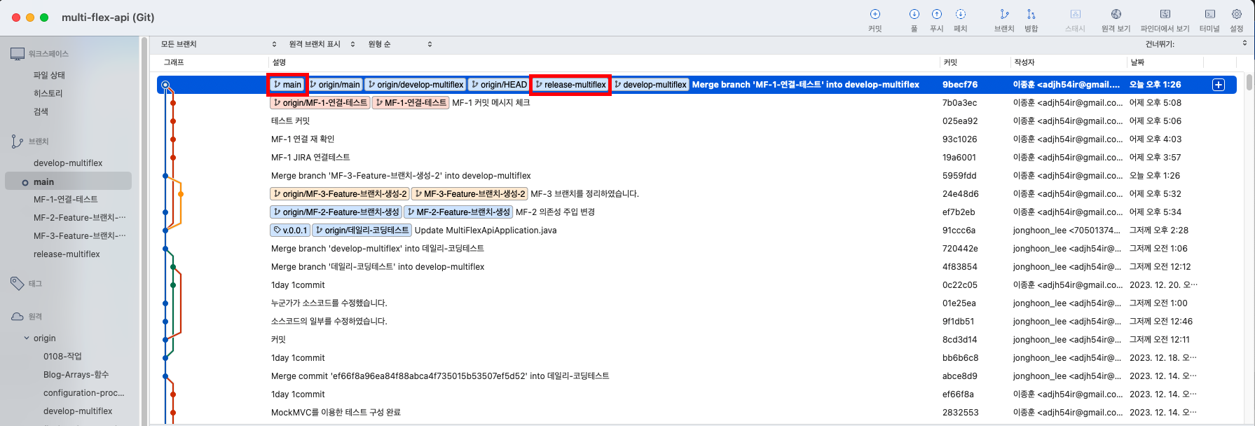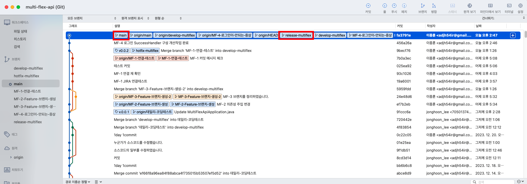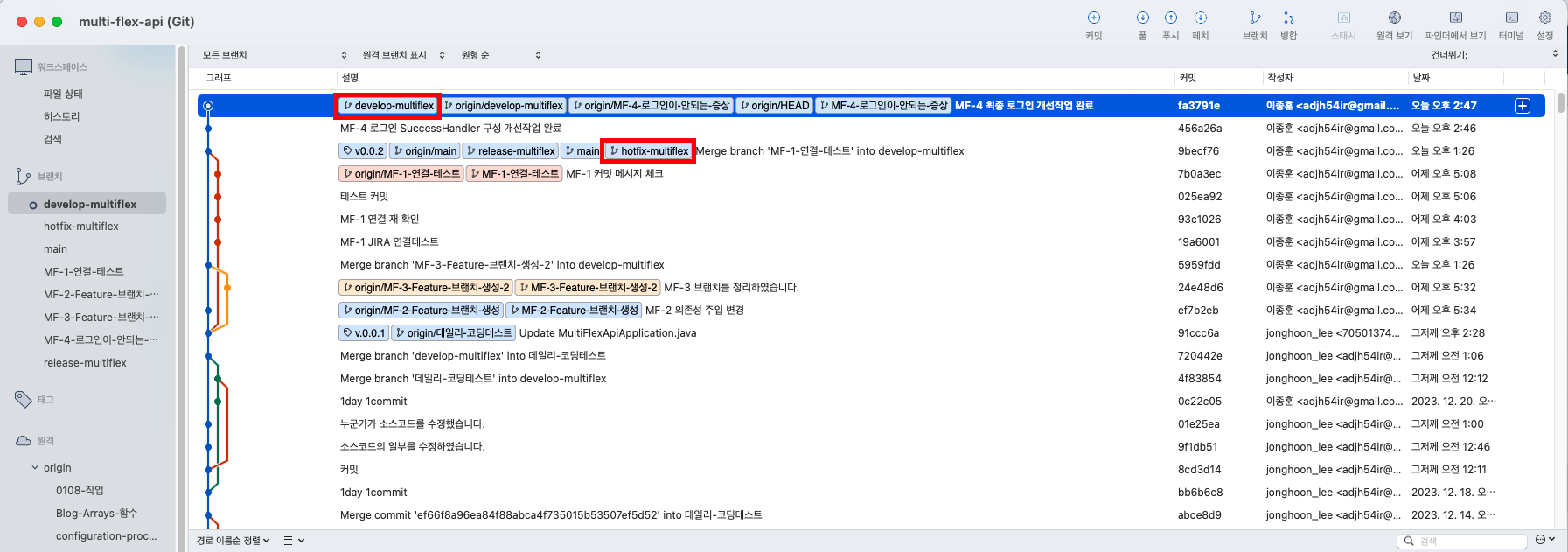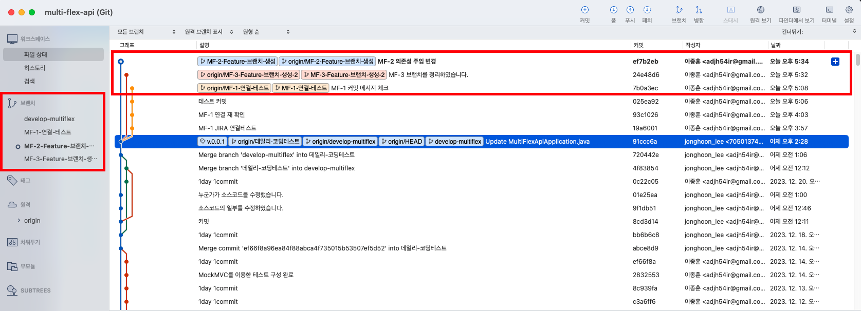 - 아래의 예시에서는 MF-1, MF-2, MF-3 이슈들에 대해서 ‘develop-multiflex’라는 Develop Branch에 병합을 하였습니다.