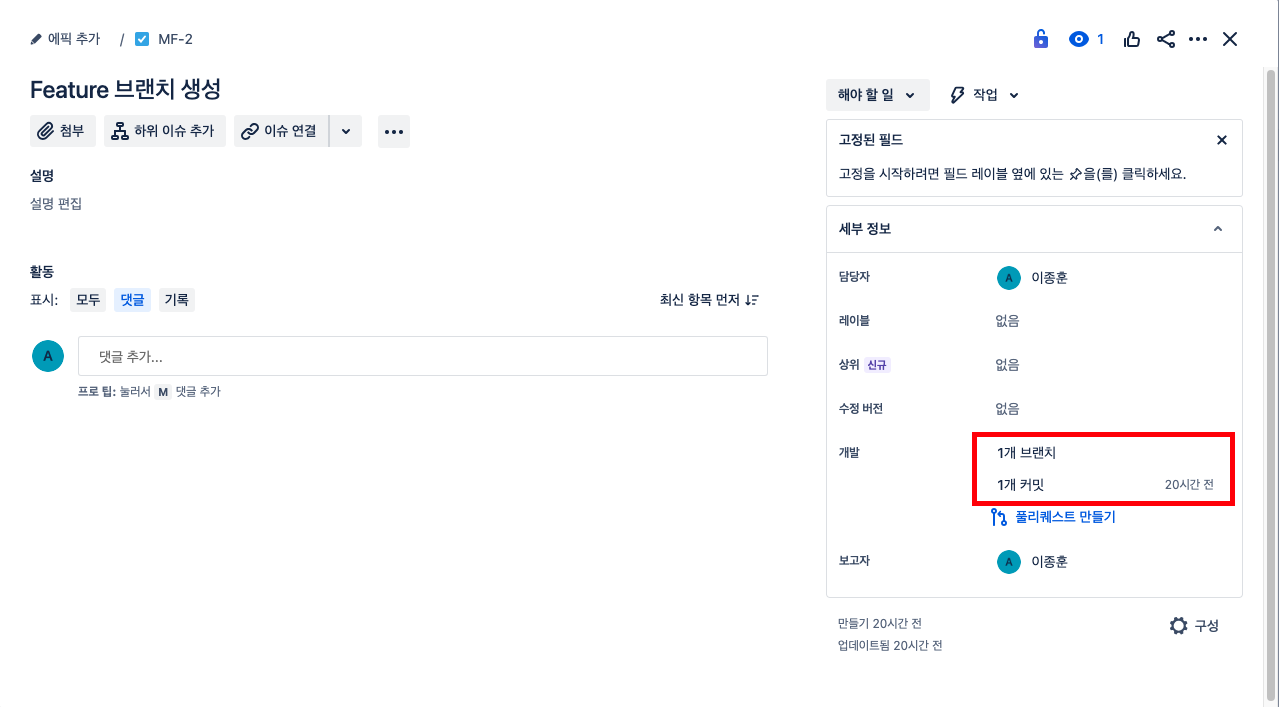 💡 위와 같이 커밋 메시지로 ‘MF-2 의존성 주입 변경’이라는 메시지로 커밋을 하게 되면 JIRA에서 이에 대한 소스 트래킹을 수행할 수 있습니다.