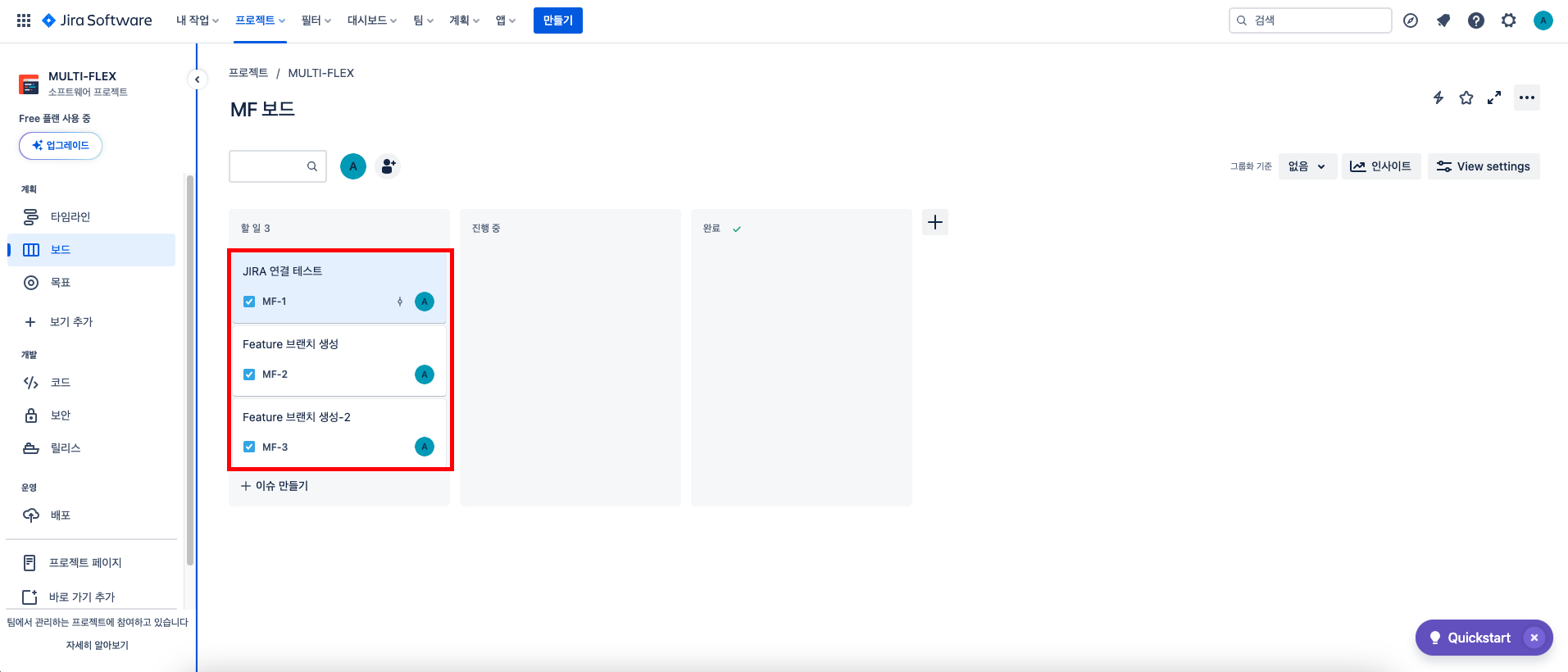 - 아래와 같이 MF-1, MF-2, MF-3 JIRA의 키 값을 기반으로 브랜치를 생성하고 ‘MF-1, MF-2, MF-3’ 형태로 커밋을 수행하였습니다.