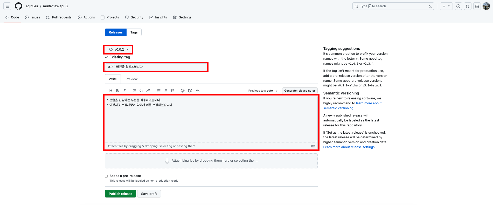 💡 아래와 같이 생성한 태그를 기반으로 릴리즈 노트를 작성하여 ‘Publish release’를 수행합니다.